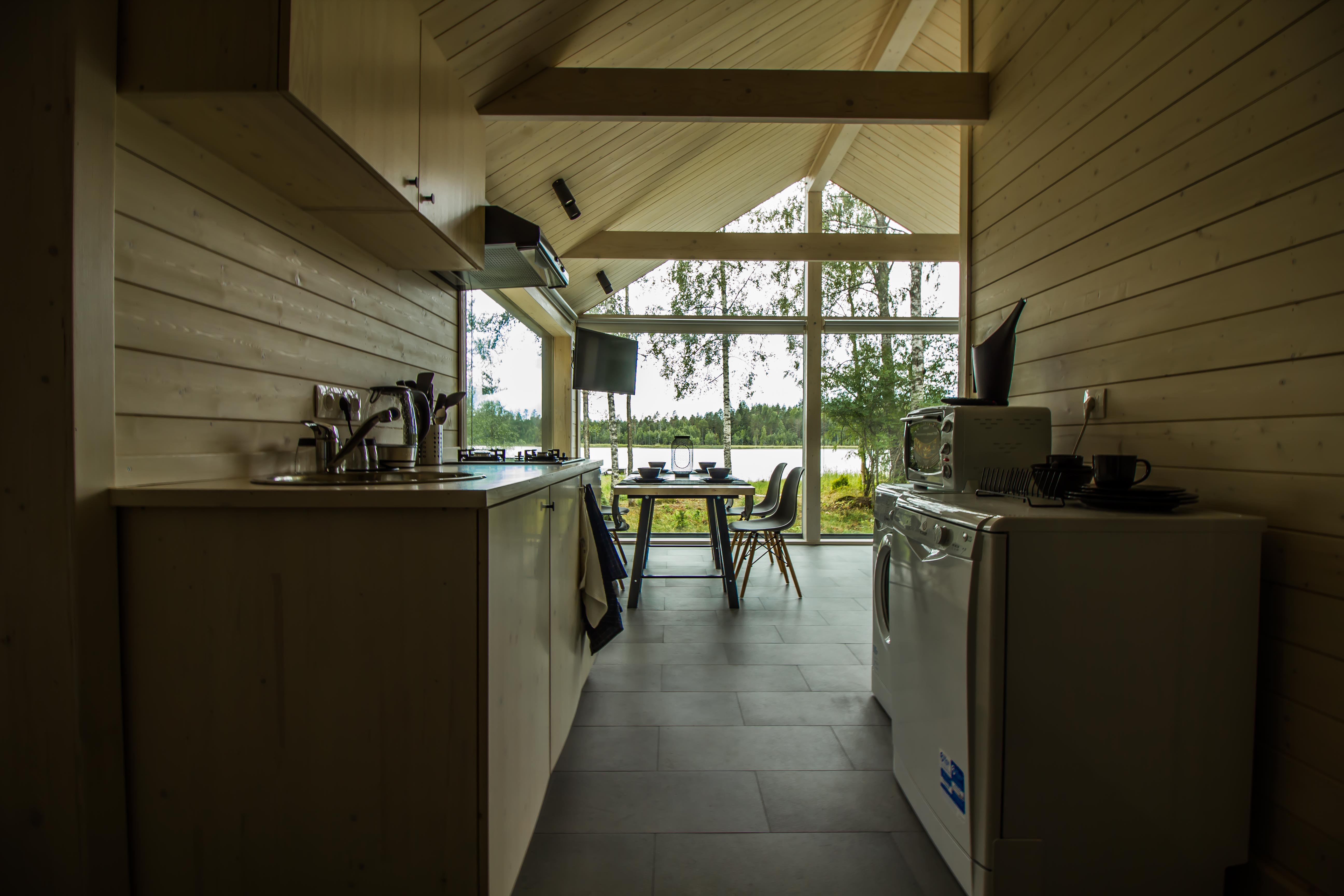 Кухня со всей необходимой техникой - плита, холодильник, посудомоечная и стиральная машины, мини печка, чайник и основной набор посуды.