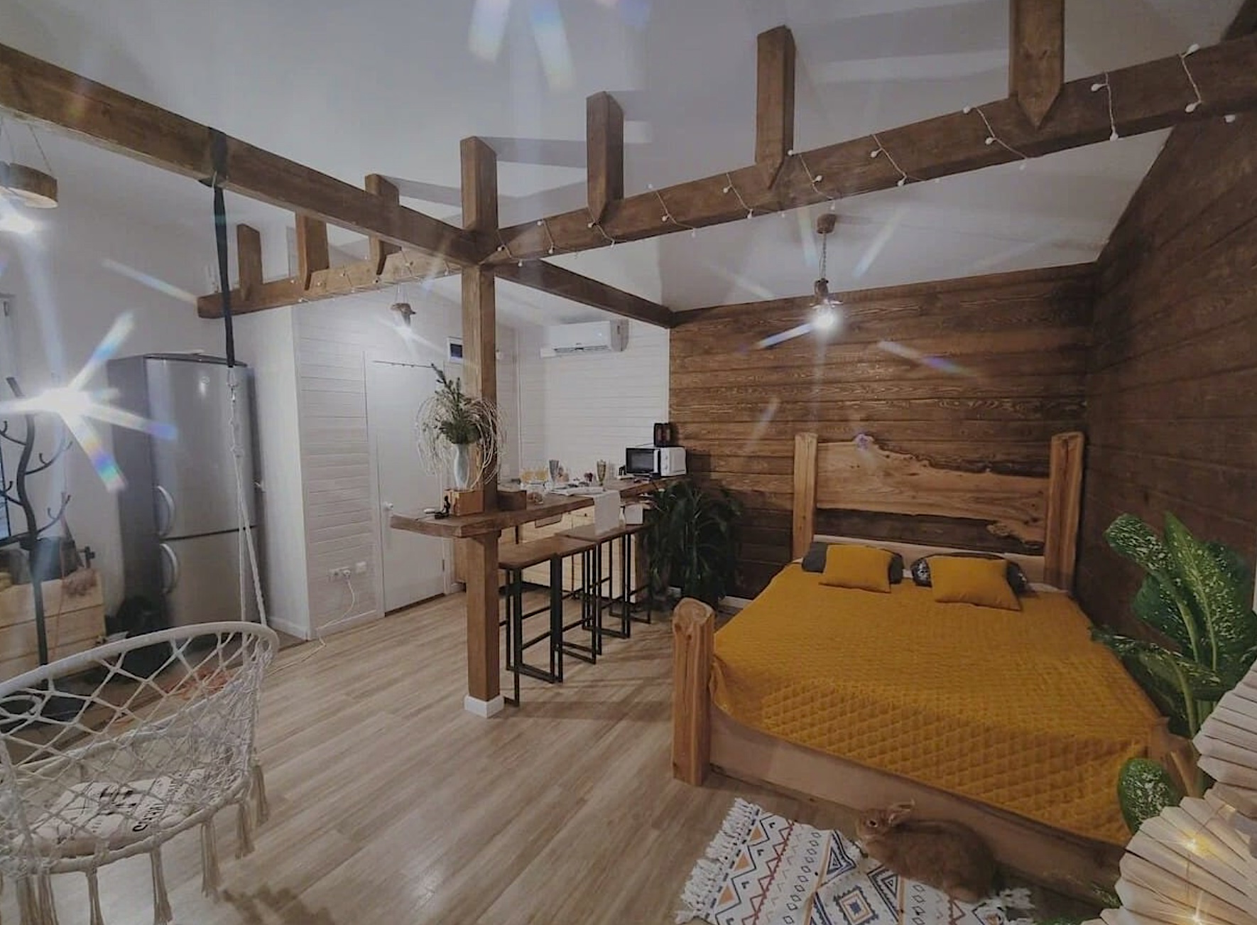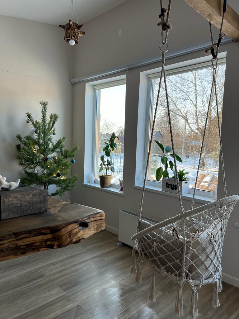 - зоная отдыха с проектором, колонкой алиса, паровым камином, креслом качелей, дизайнерской кроватью ручной работы из ценных пород дерева, качественным матрасом, свечами и подсветкой для романтического вечера (свет управляется алисой , его можно регулировать от тусклого до яркого и разноцветного), отличным wifi, халаты, тапочки;