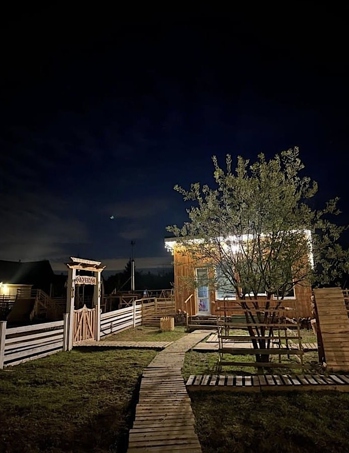 мангальная зона с беседкой и уличной декоративной подсветкой;