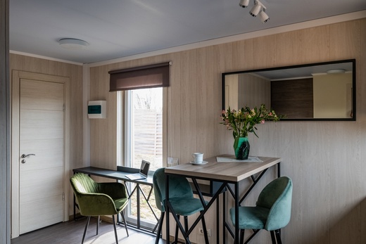 В домике есть wi-fi, мини-бар, индукционная плита, микроволновая печь, набор необходимой посуды, ТВ, большая душевая кабина.