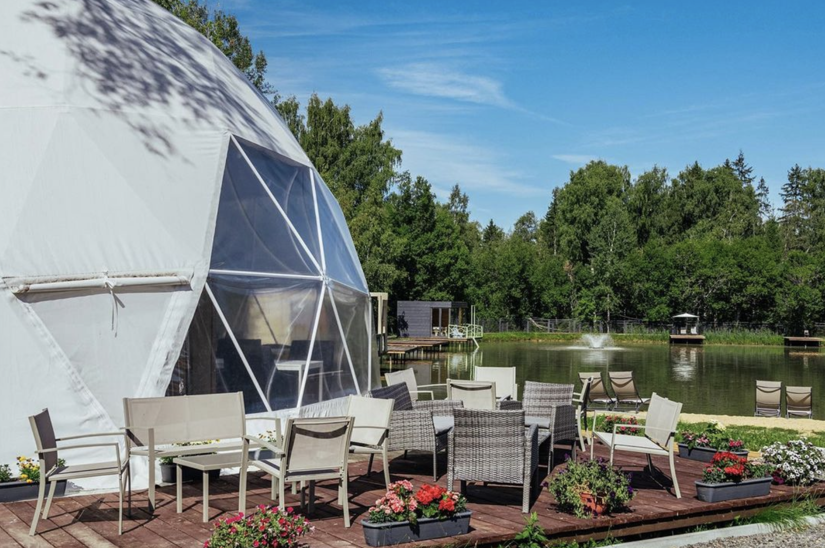 Плюс высокий уровень сервиса и все необходимое: уютные домики, уникальный купольный глэмп, удобные лежаки, полностью подготовленную баню, ресторан и многое другое.