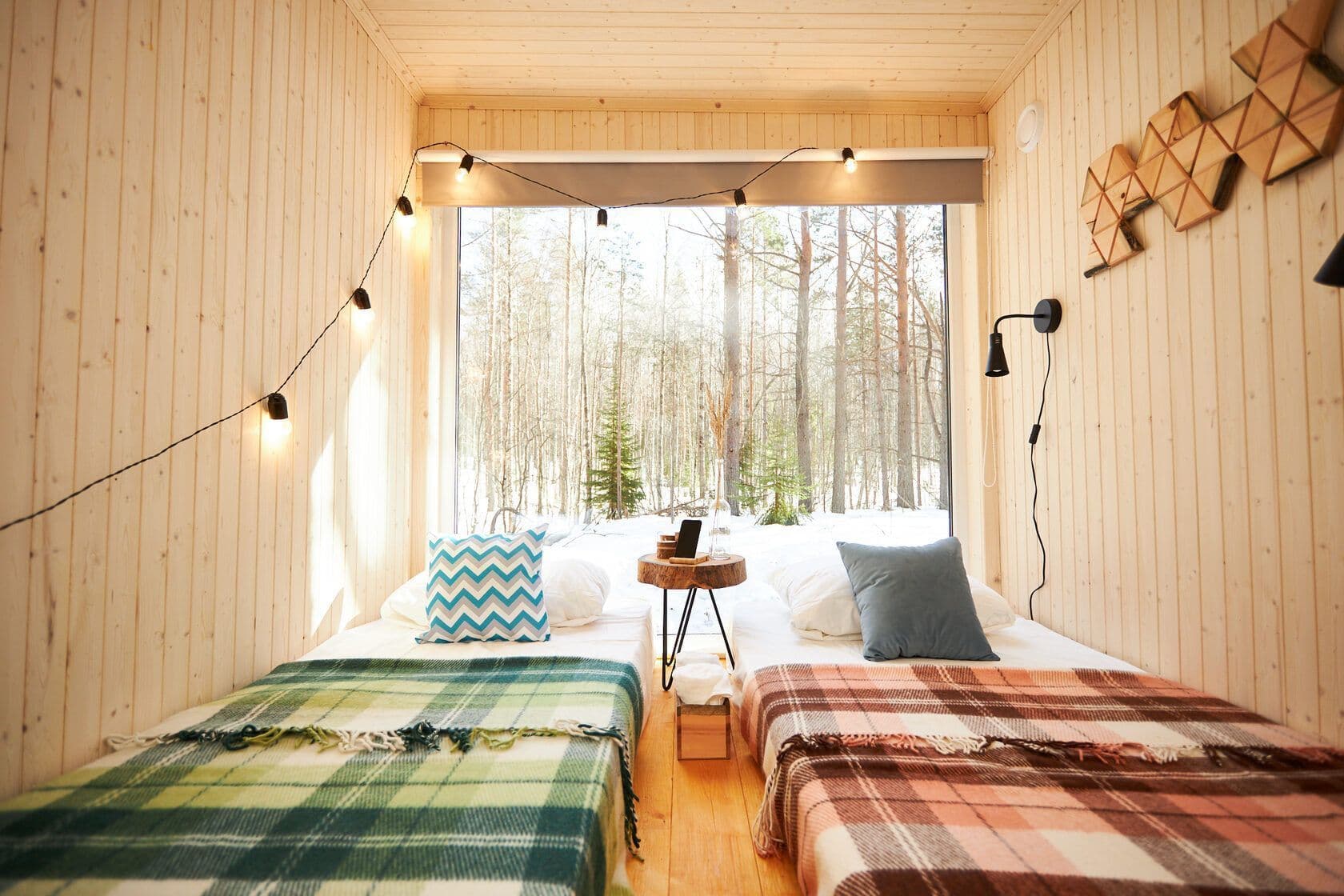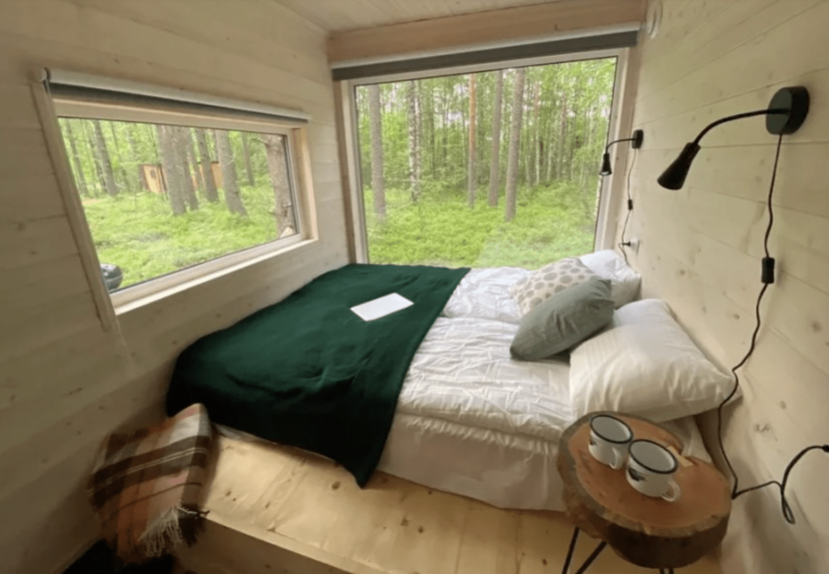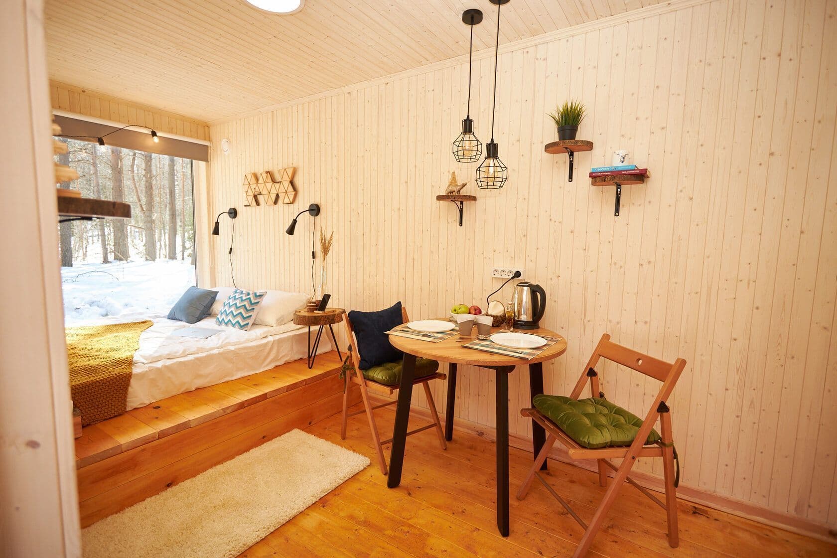 - панорамное окно во всю стену с видом на лес