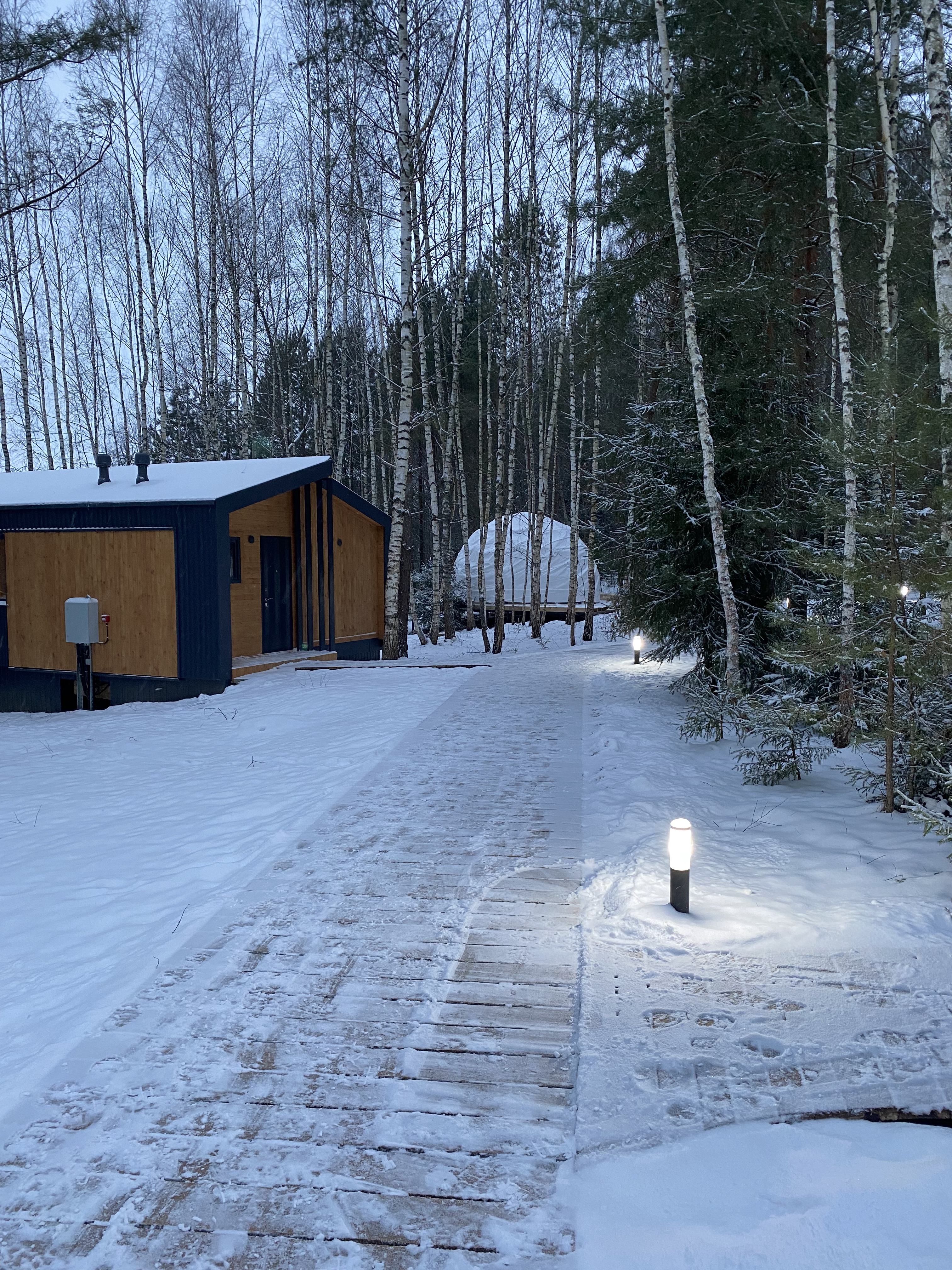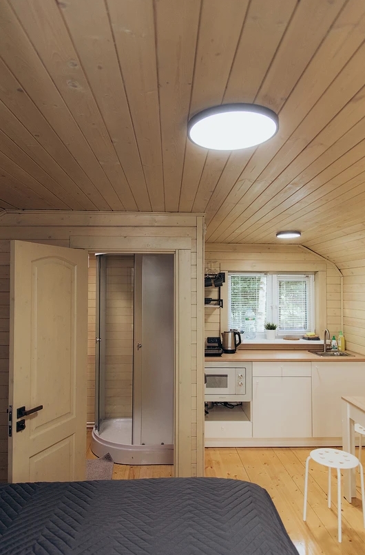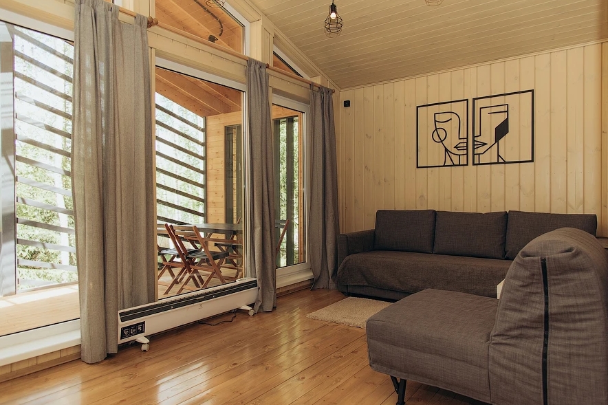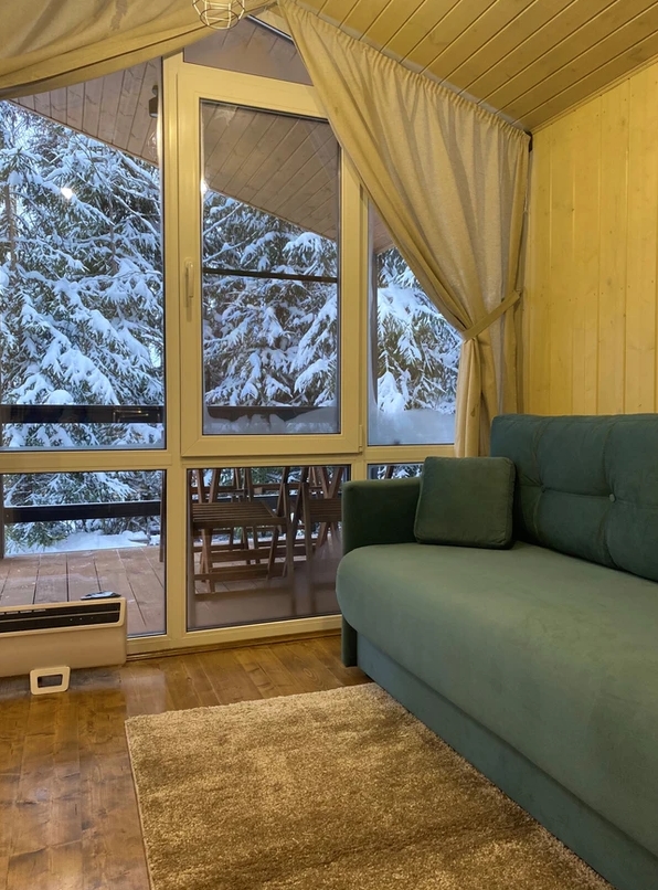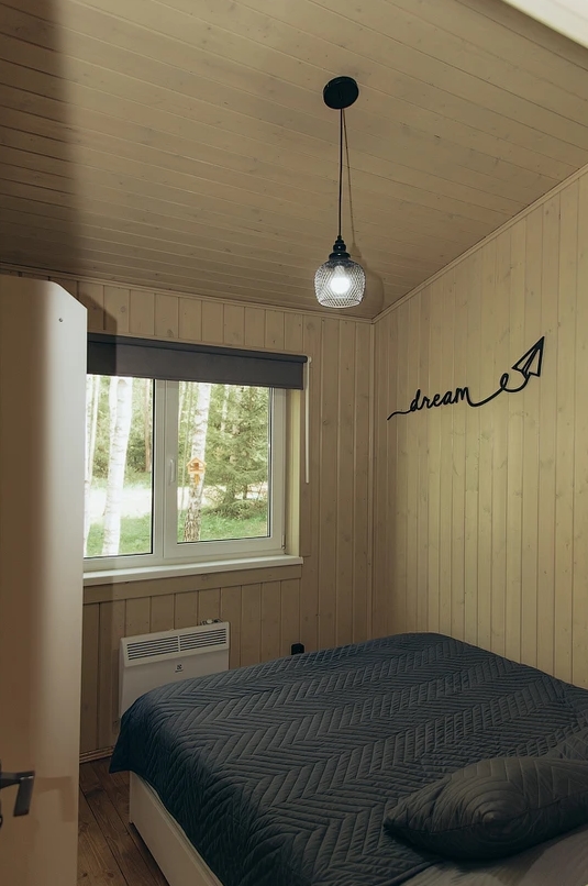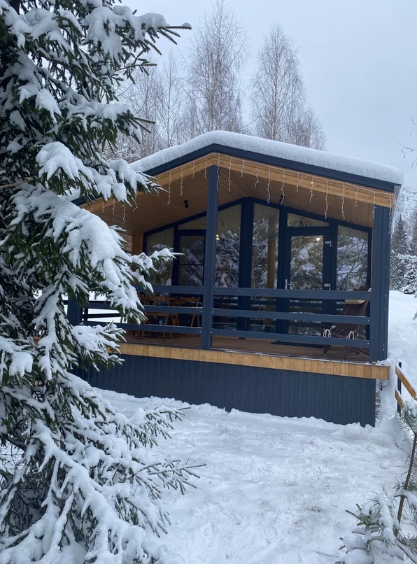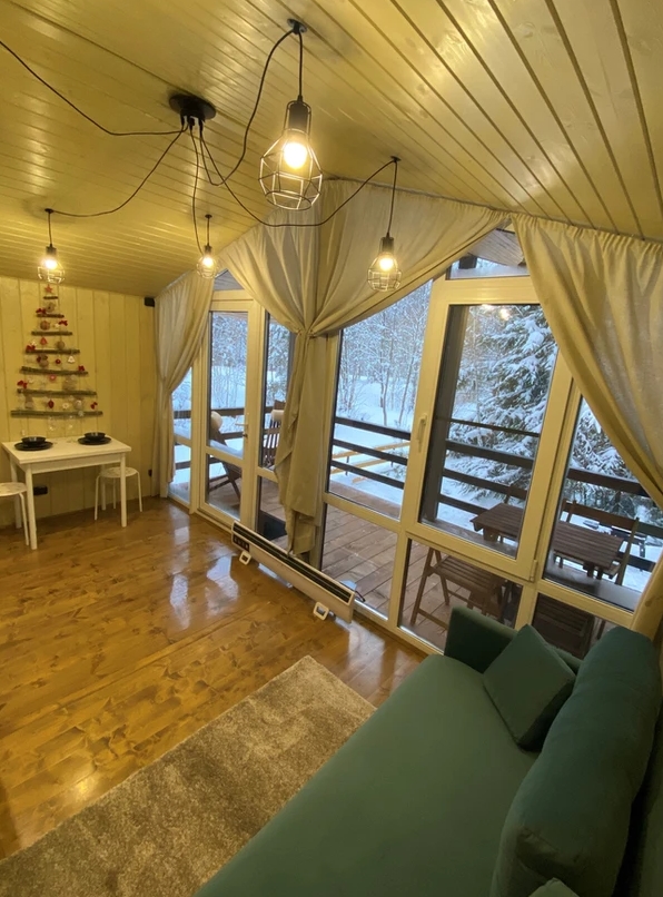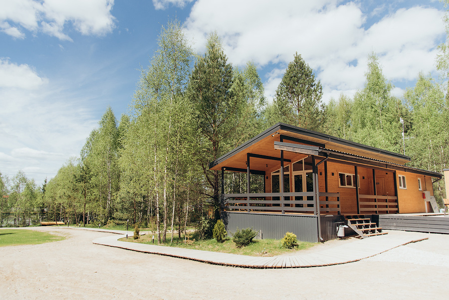 В доме большие панорамные окна с видом на озеро, большая двуспальная кровать с ортопедическим матрацем, диван-кровать на 2 спальных места, кухня, холодильник, микроволновая печь, индукционная плита с набором посуды, чайник, чайный набор, обеденный стол, стулья, набор столовой посуды. Отопление – электрические конвекторы с памятью режимов настроек. Бесплатный Wi-Fi. Размещение 2 взрослых места, 1 или 2 дополнительных места по запросу за доплату, детская кроватка – по запросу. Площадь дома 28 м2.