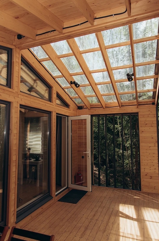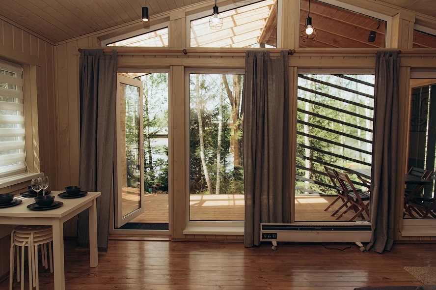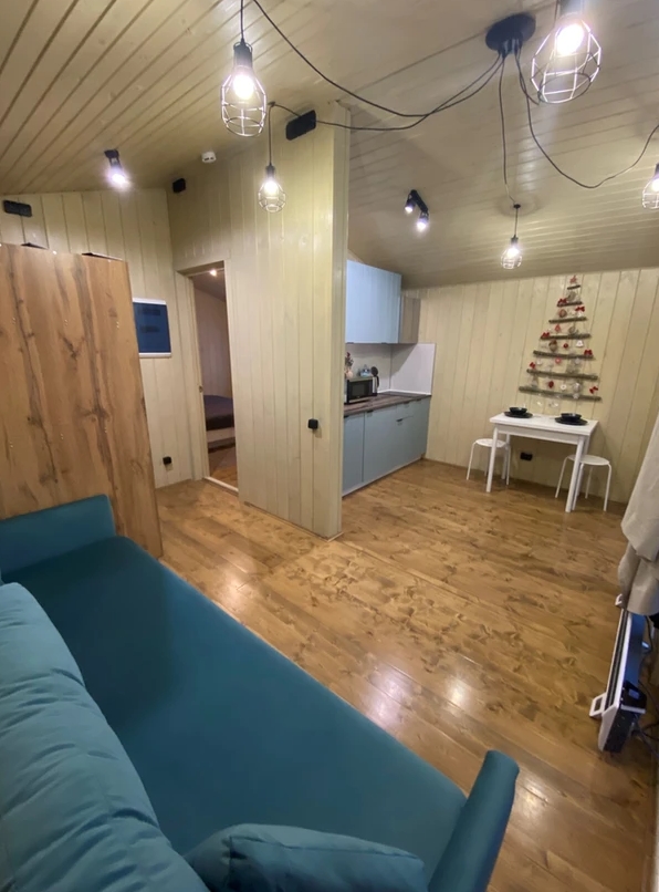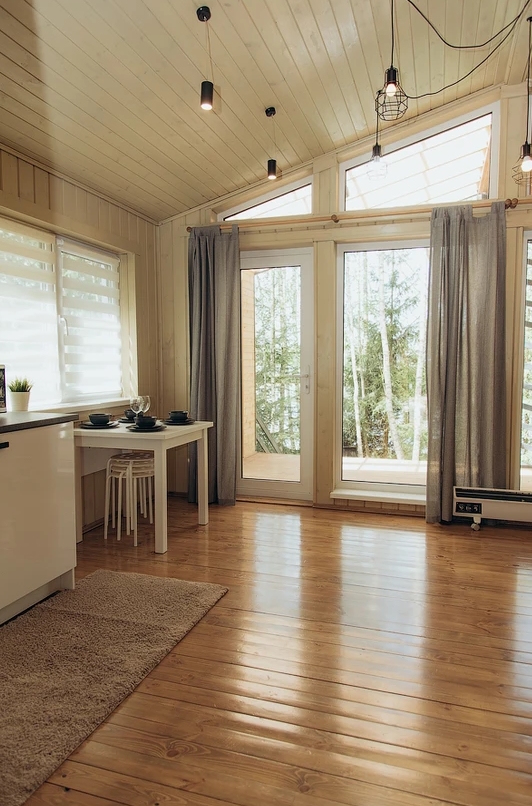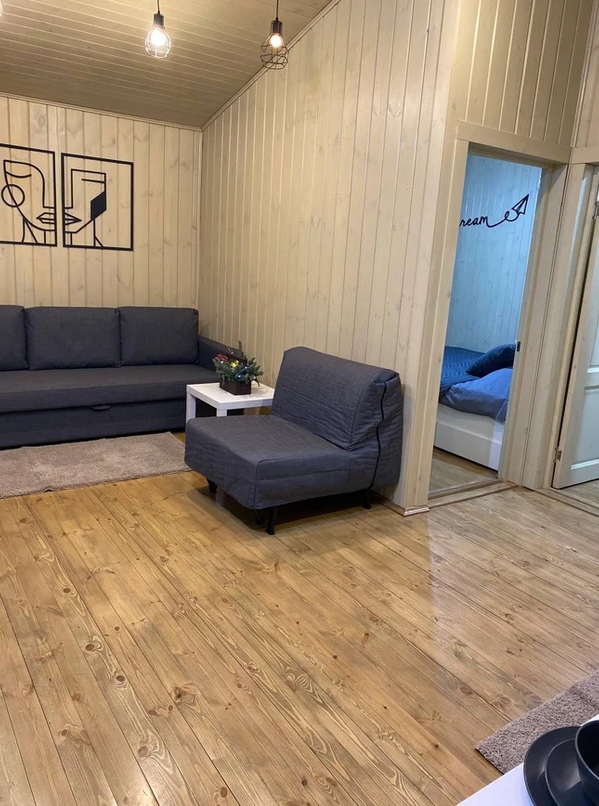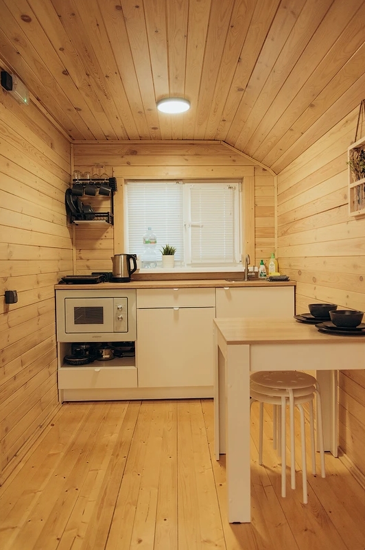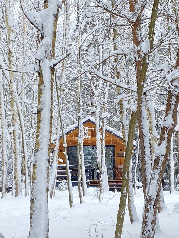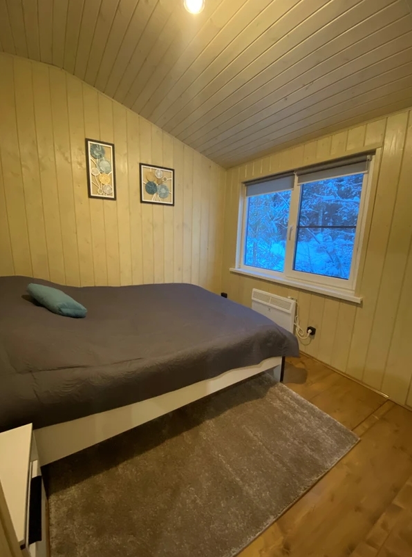 В доме большие панорамные окна с видом на озеро, большая двуспальная кровать с ортопедическим матрацем, диван-кровать на 2 спальных места, кухня, холодильник, микроволновая печь, индукционная плита с набором посуды, чайник, чайный набор, обеденный стол, стулья, набор столовой посуды. Отопление – электрические конвекторы с памятью режимов настроек. Бесплатный Wi-Fi. Размещение 2 взрослых места, 1 или 2 дополнительных места по запросу за доплату, детская кроватка – по запросу. Площадь дома 28 м2.