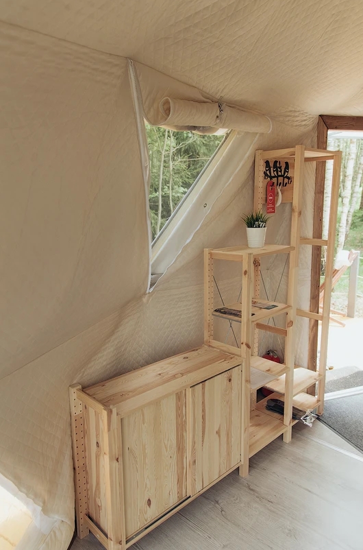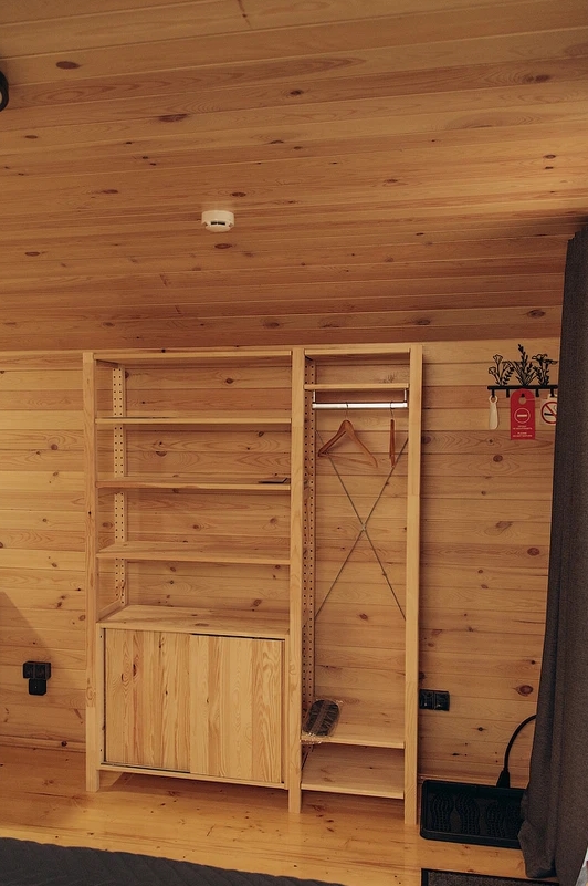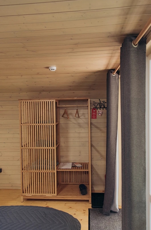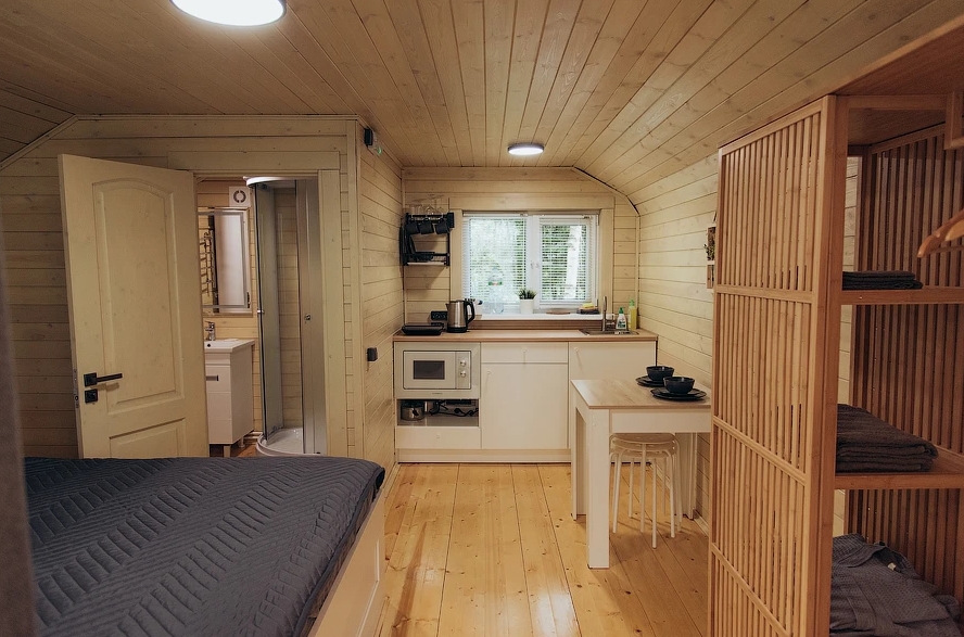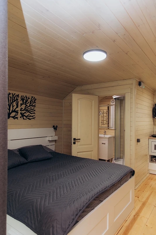 Большое панорамное окно с видом на озеро и лес, большая двуспальная кровать с ортопедическим матрацем, мини-кухня, холодильник, встроенная микроволновая печь, индукционная плита с набором посуды, чайник, чайный набор, обеденный стол, стулья, набор столовой посуды. Отопление – электрический конвектор с памятью режимов настроек. Бесплатный Wi-Fi. Размещение 2 взрослых места. Детская кроватка – по запросу. Площадь номера 18м2.