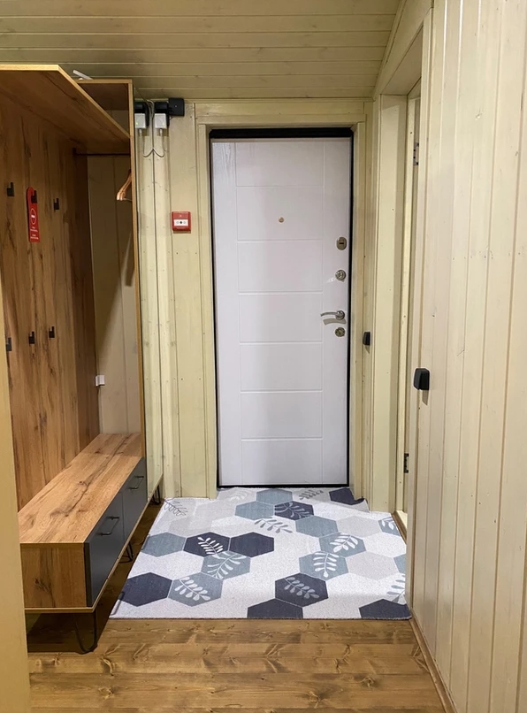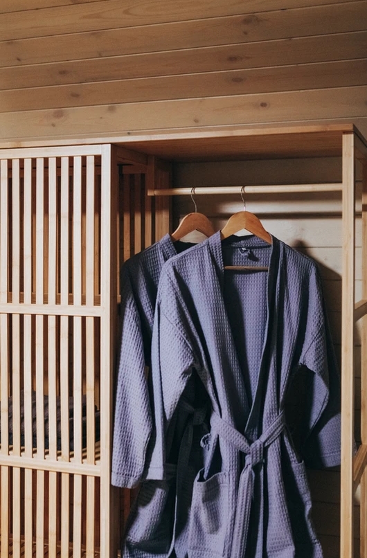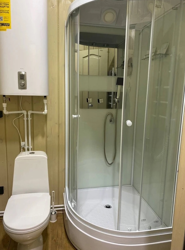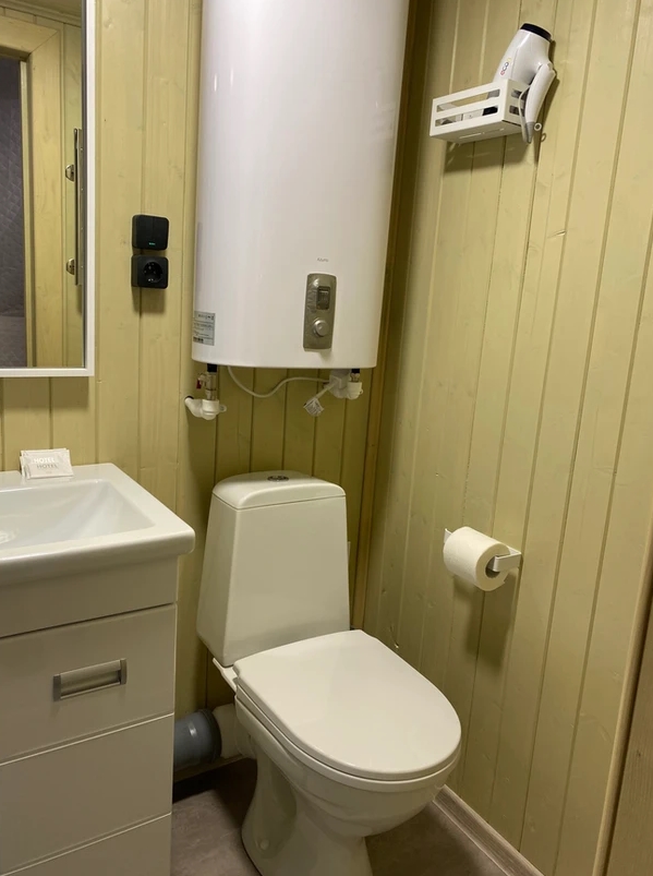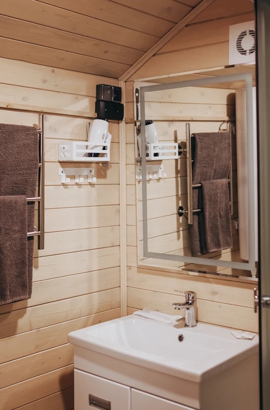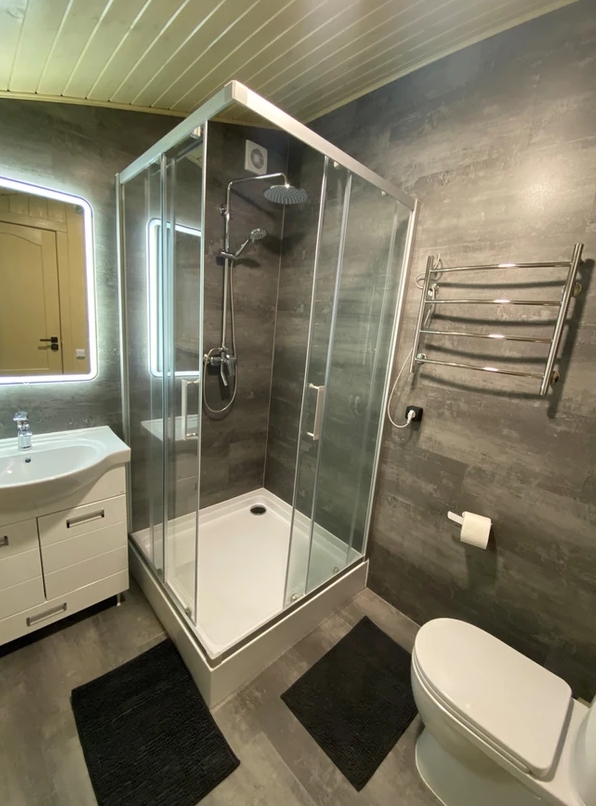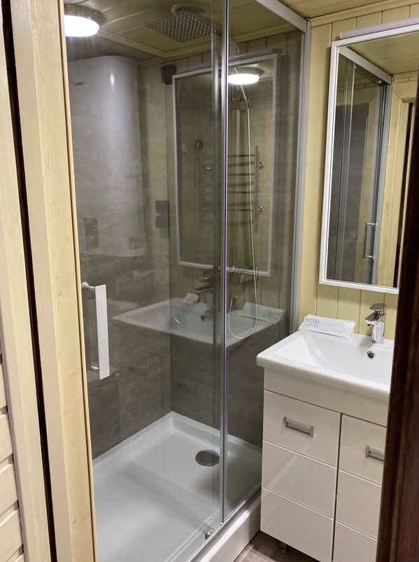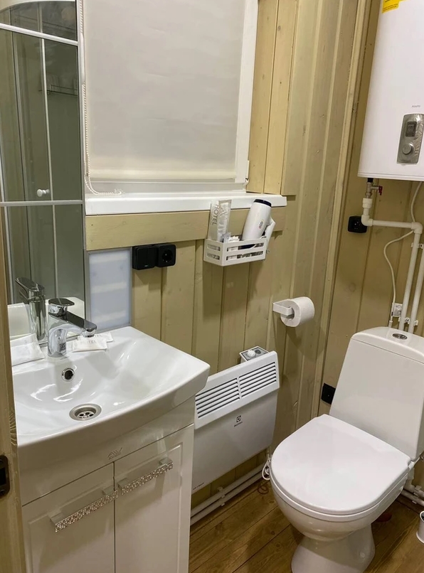 Душевая кабина, унитаз, умывальник, зеркало с подсветкой, водонагреватель, полотенцесушитель, фен, халаты, тапочки, полотенца. Средства гигиены включены в стоимость проживания.
