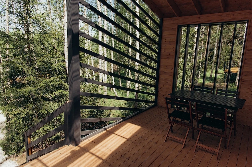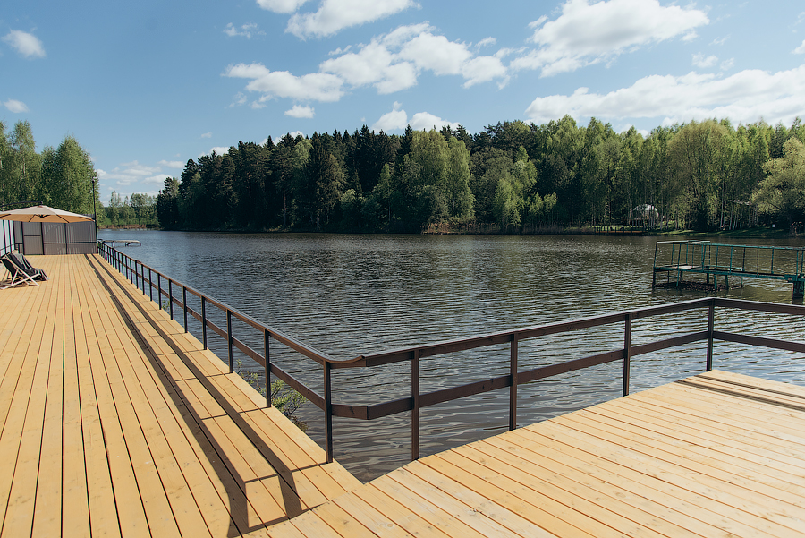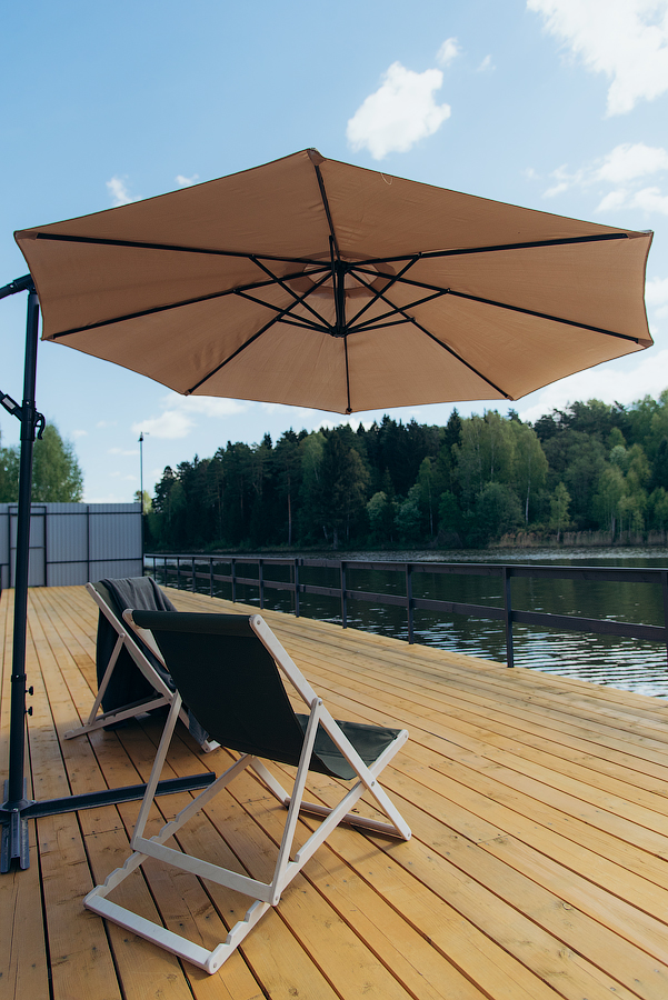 Зона барбекю расположенна непосредственно возле водоема. Мангал, решетки, шампуры, дрова – все включено в стоимость проживания. Терраса (12м2) оборудована комплектом деревянной мебели и шезлонгами.