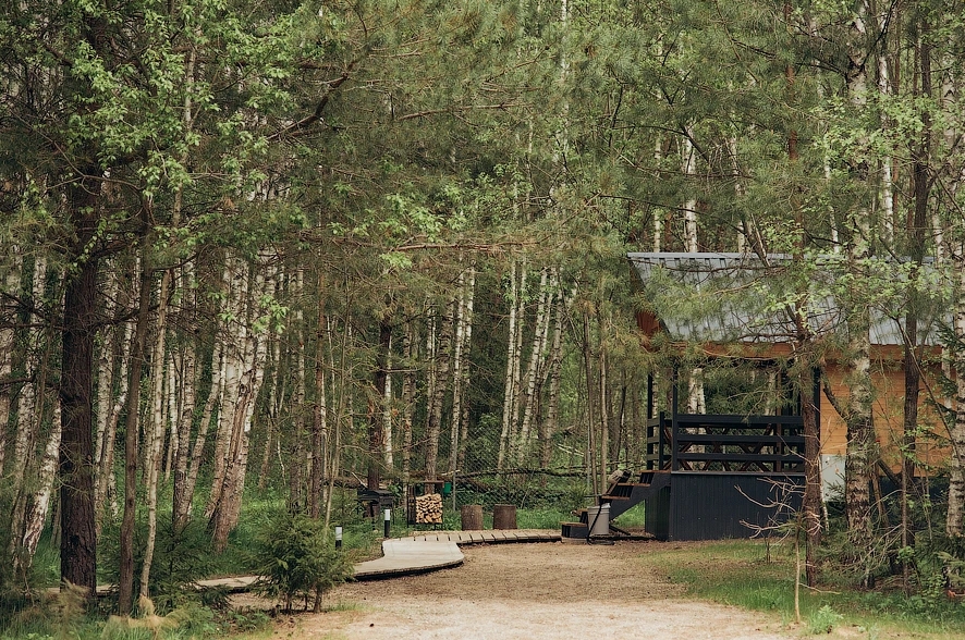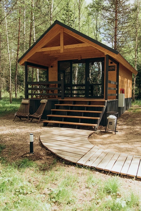 Домик расположен в глубине живописного леса, на отдалении от соседних объектов. К домику ведет деревянная дорожка. Отличное место для любителей уединиться и наслаждаться прекрасными видами.