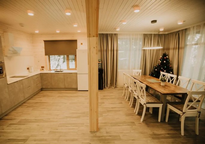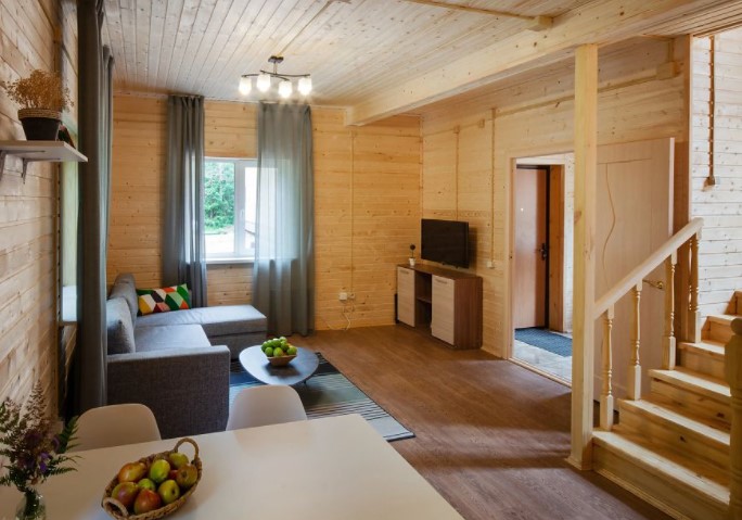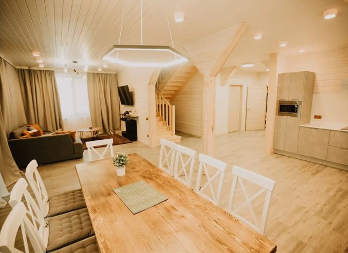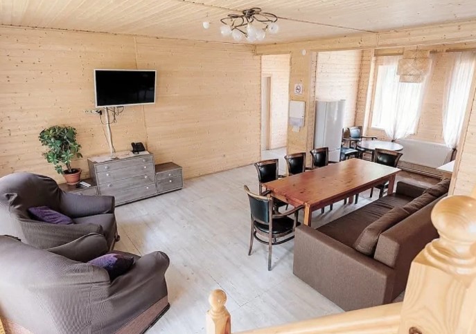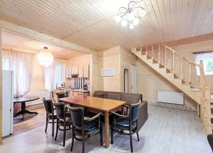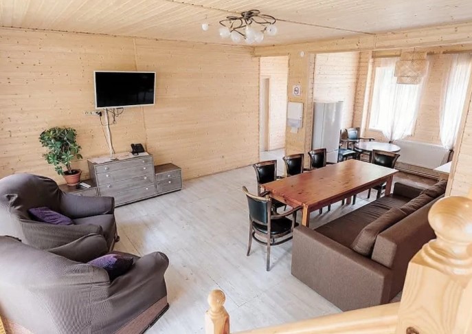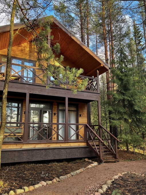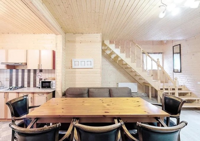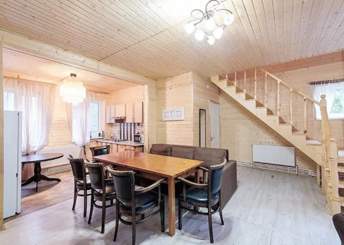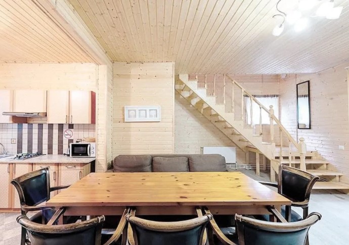 Двухэтажный дом (часть дуплекса) с отдельным входом оснащен всем, что может понадобиться для хорошего отдыха. Здесь с комфортом могут разместиться до шести гостей: для этого есть 2 спальни (4 места) и диван на первом этаже (2 дополнительных места). Прекрасный выбор для семьи или компании друзей. Кроме того, в коттеджах разрешено проживать с питомцами: уверены, им тоже у нас понравится. Страховой возвратный депозит - 5000 руб.