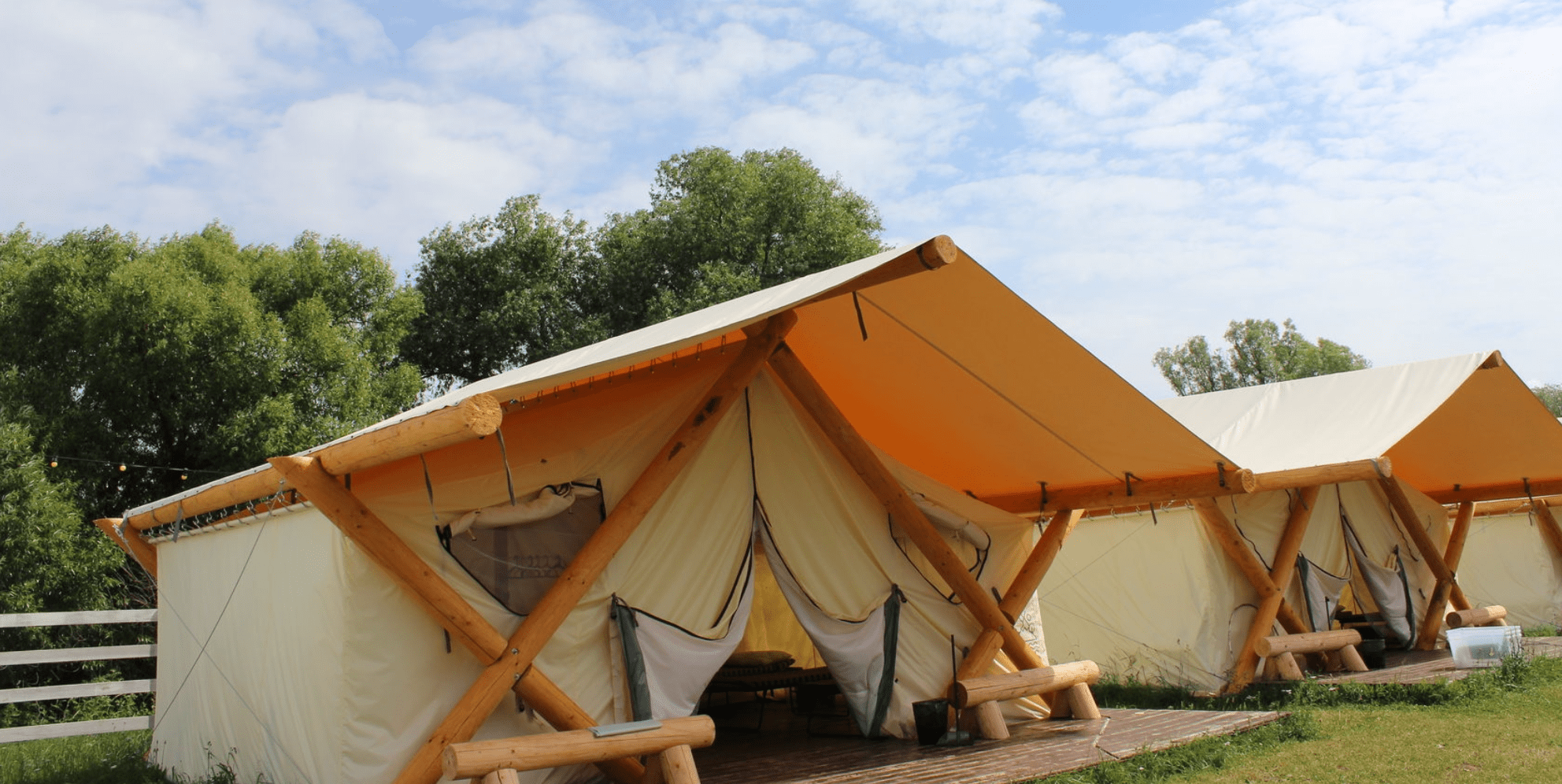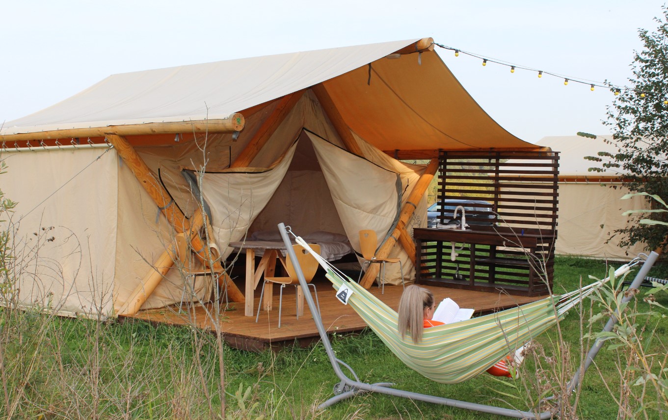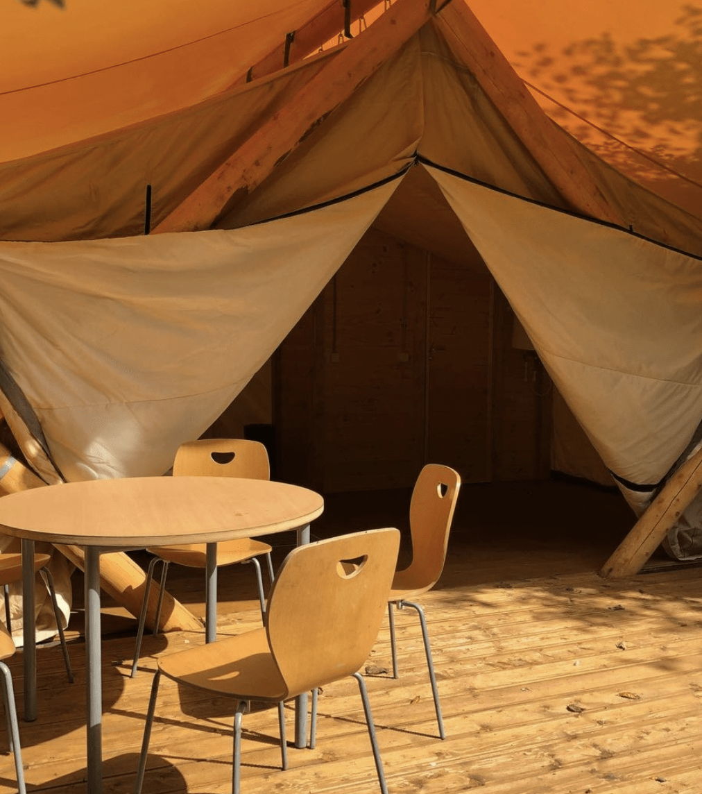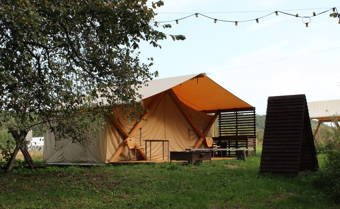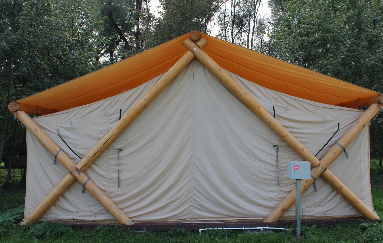 Сафари тент, с раскладными кроватями (матрас + наматрасник, подушка + наволочка). Санблок находится на территории. Свое костровое место, в палатке есть электричество. Обогреватель по запросу (бесплатно)