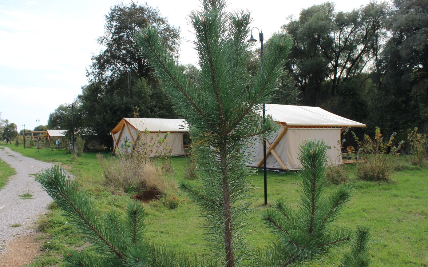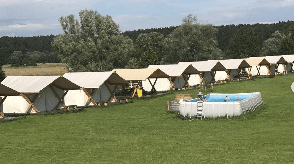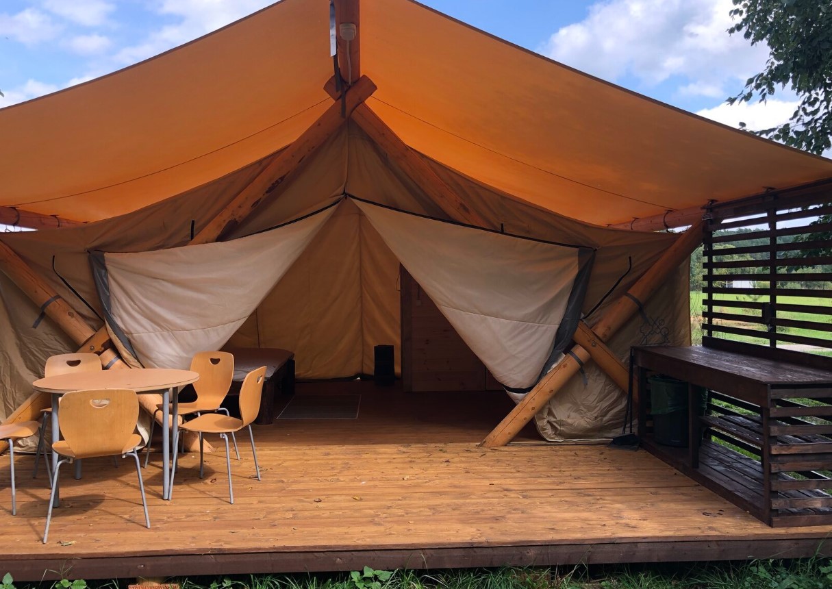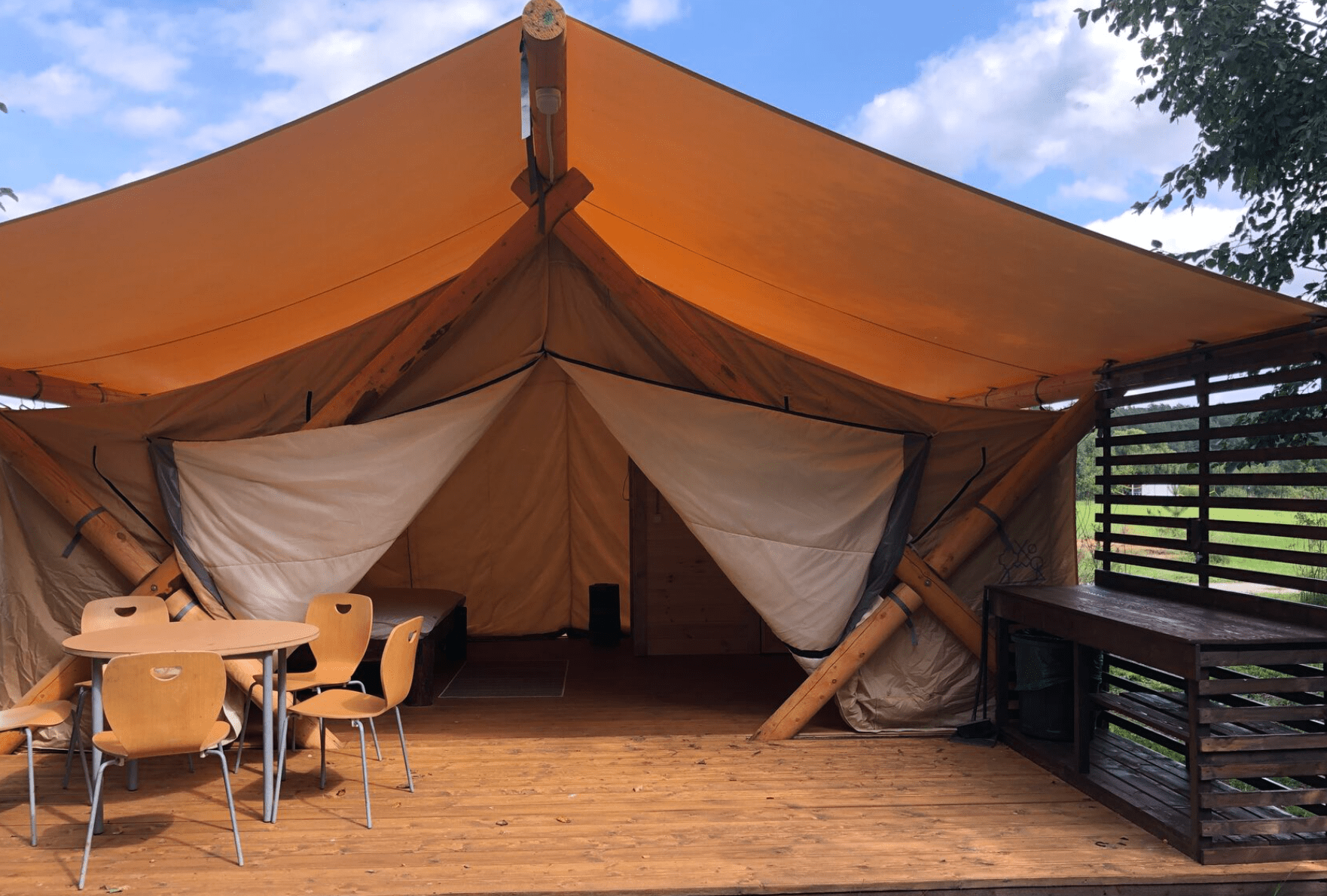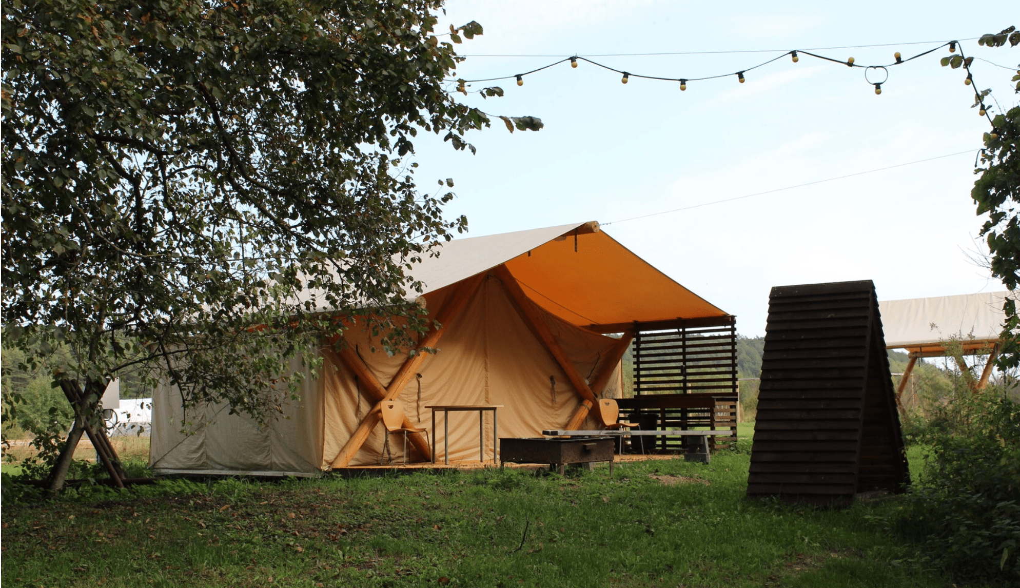 Сафари тент, с раскладными кроватями (матрас + наматрасник, подушка + наволочка). Санблок находится на территории. Свое костровое место, в палатке есть электричество. Обогреватель по запросу (бесплатно)