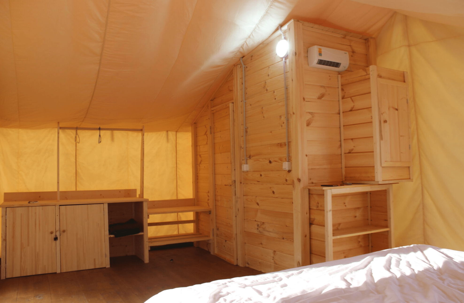 Сафари-тент с двуспальной кроватью (при необходимости для детей подставляем раскладные кровати, до 2-х). В номере есть сан-блок, индукционная плита, электрическая турка, полотенца, шкаф для одежды, прикроватные тумбочки, обогреватель.