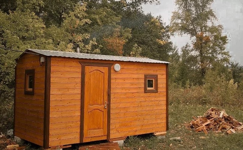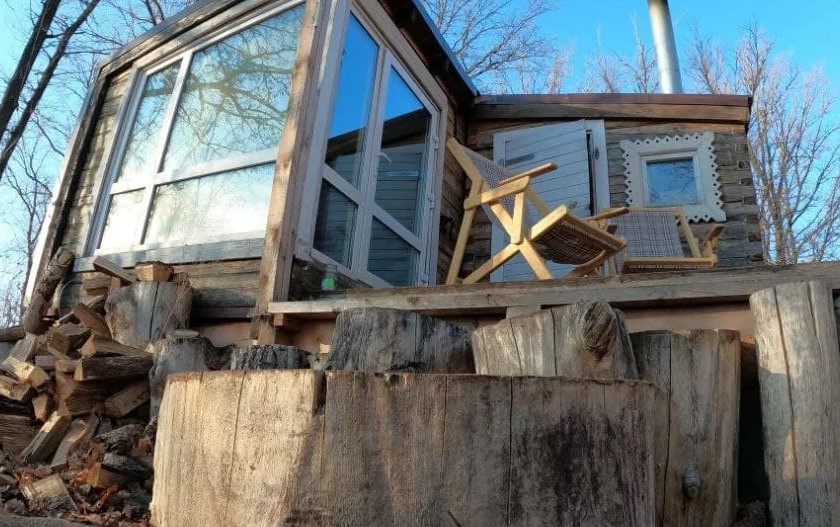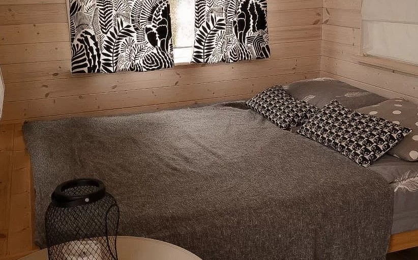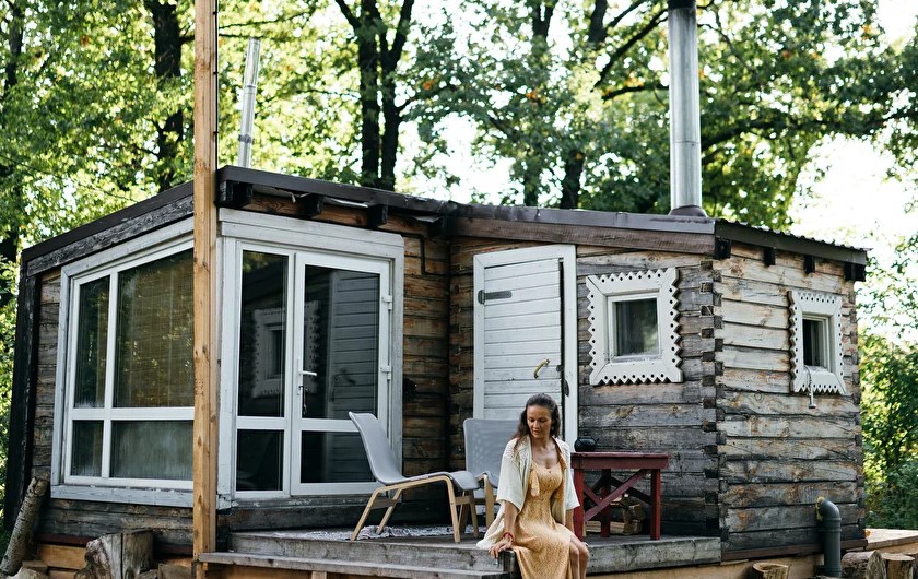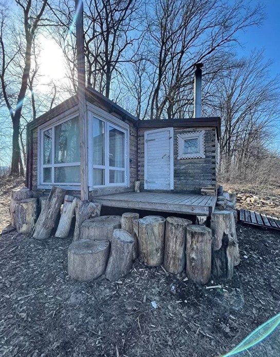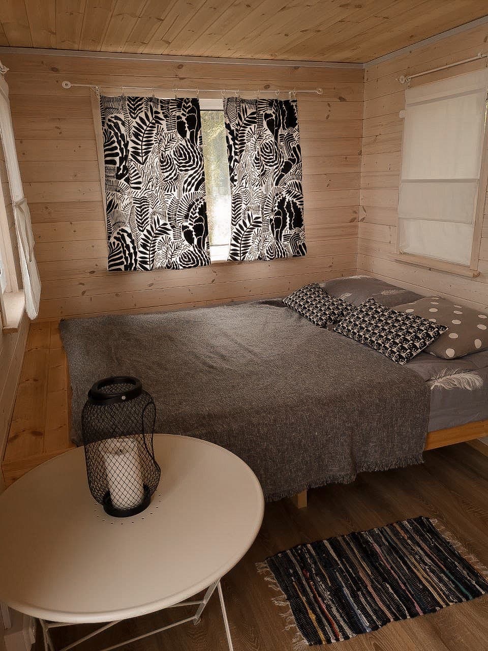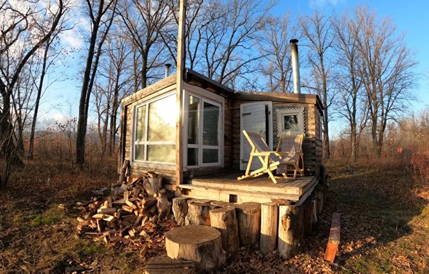 Это маленький стильный домик в духе Генри Дейвида Торо. Вы можете почувствовать себя поэтом, живущим в уединении в лесу. Или с подружкой. Но в отличие от жилища американского поэта, здесь есть холодильник, горячая и холодная вода в комнате, к домику пристроена баня, туалет находится непосредственно в ней, вход в баню и туалет идёт через терассу и улицу, надеемся это добавит вам ощущения приключений, а не разочарований, что вы встретились с настоящей лесной стихией и дух приключений не оставит вас вдали от города.