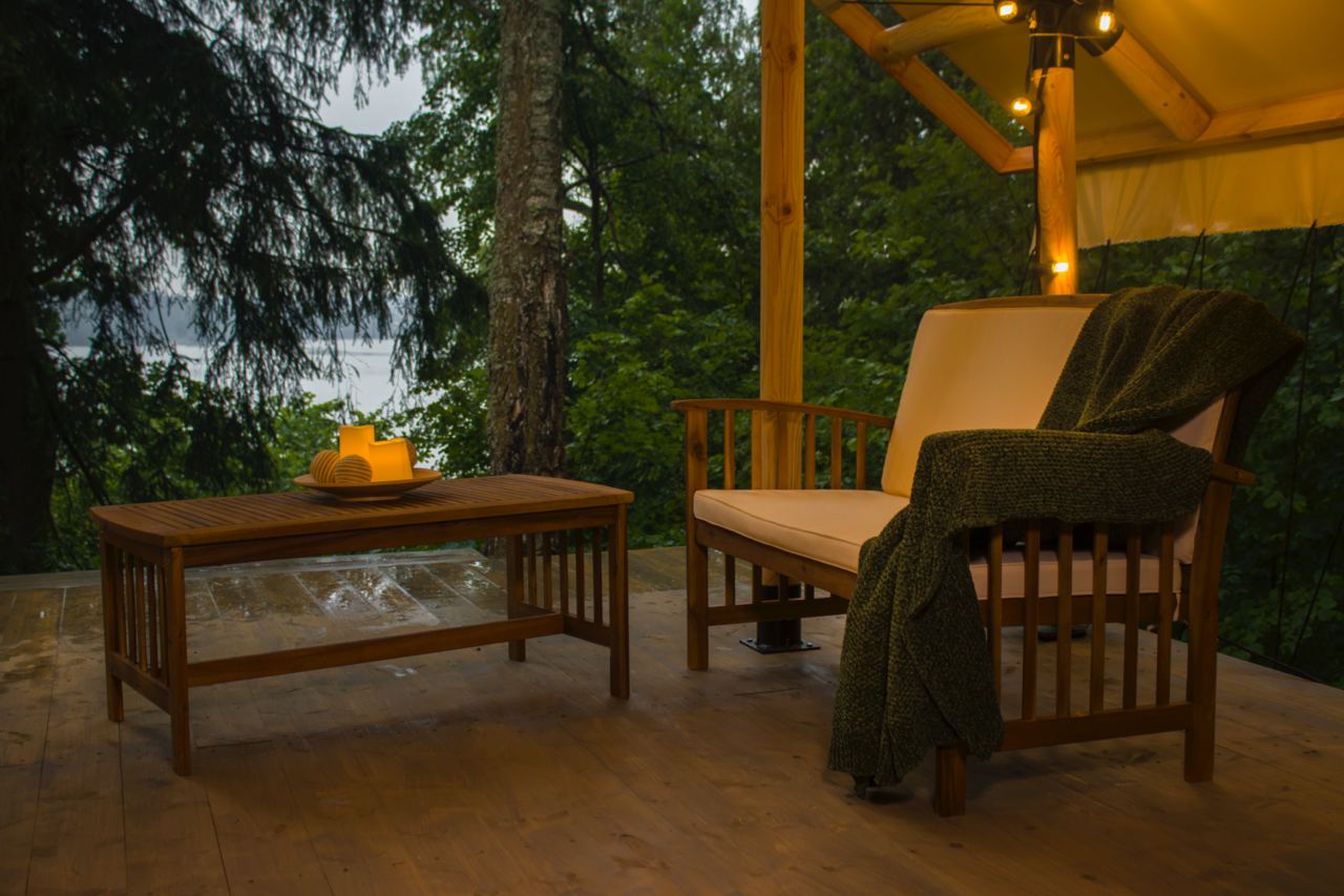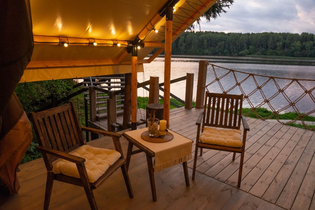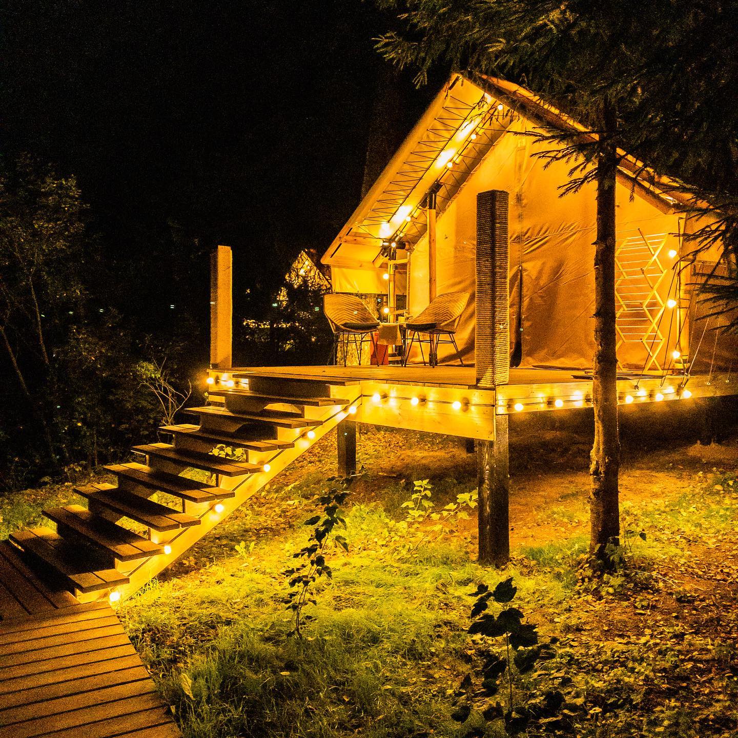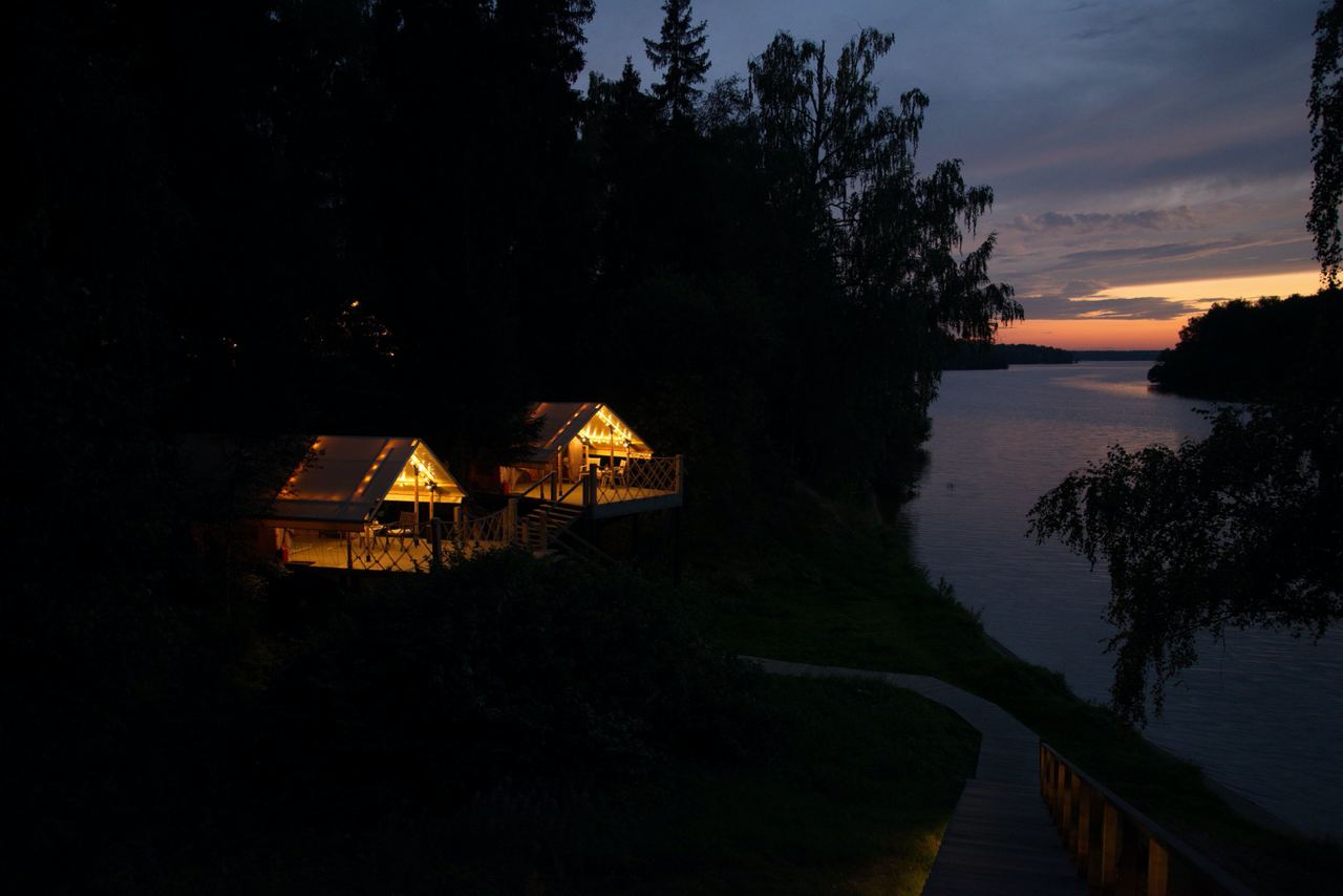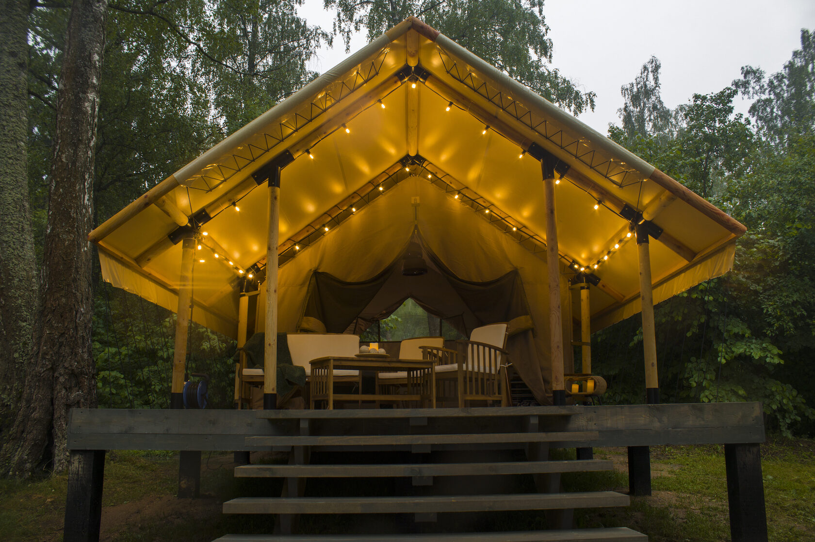 Глэмпинг Под Небом — это модульный отель высокого уровня со своим рестораном и развлечениями. Вы сможете жить в комфортабельном шатре площадью 24 м2, спать на полноценной кровати. И при этом — всего в нескольких метрах от берега, среди деревьев. Засыпать под плеск волн и просыпаться от пения лесных птиц.