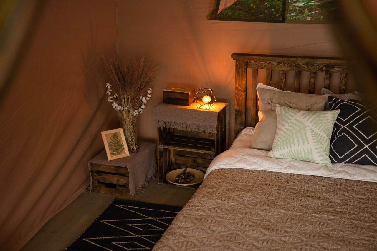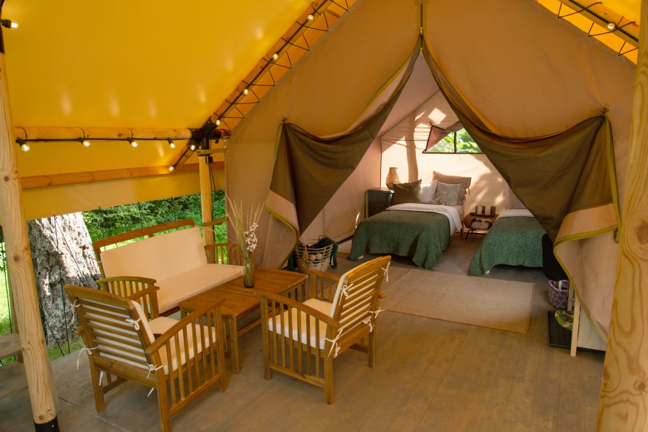 2. Палатки меблированы большими удобными кроватями с ортопедическими матрасами, удобными креслами, столиками и стеллажами для ваших вещей.