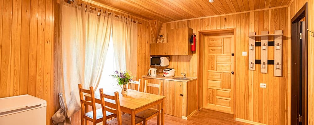 Удобный вариант снять коттедж на Алтае в сосновом бору у реки для большой семьи или небольшой компании. В четырех комнатах первого этажа на 45 м.кв. легко разместятся 6 человек: на 4 основных местах и двух дополнительных. В номере: 2 спальни, комната столовая, зал с камином, две 2х-спальные кровати, диван, кухонный уголок, сервированный посудой, оборудованный мультиваркой, холодильником, электрочайником, микроволновкой, двумя шкафами, обеденным столом с четырьмя стульями. В каминном зале — телевизор. В коттедже — Wi-Fi интернет.