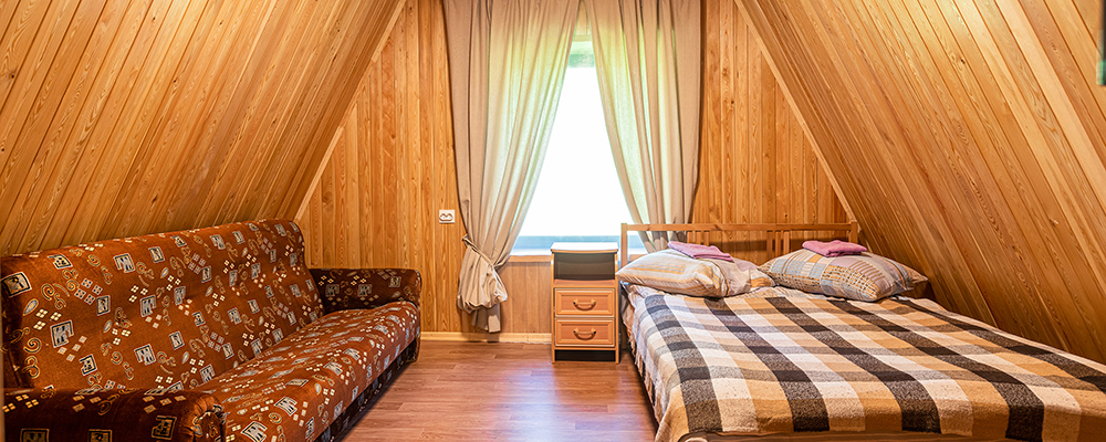 Удобный вариант снять коттедж на Алтае в лесу у реки для большой семьи или небольшой компании. В двух комнатах второго этажа на 40 м.кв. легко разместятся 6 человек: на 4 основных местах и двух дополнительных. В номере: 2 комнаты, две 2х-спальные кровати, диван, телевизор, кухонный уголок с мойкой, сервированный посудой, мультиваркой, электрочайником, микроволновкой, небольшим холодильником, посудный шкаф, обеденный стол с четырьмя стульями. Wi-Fi интернет.