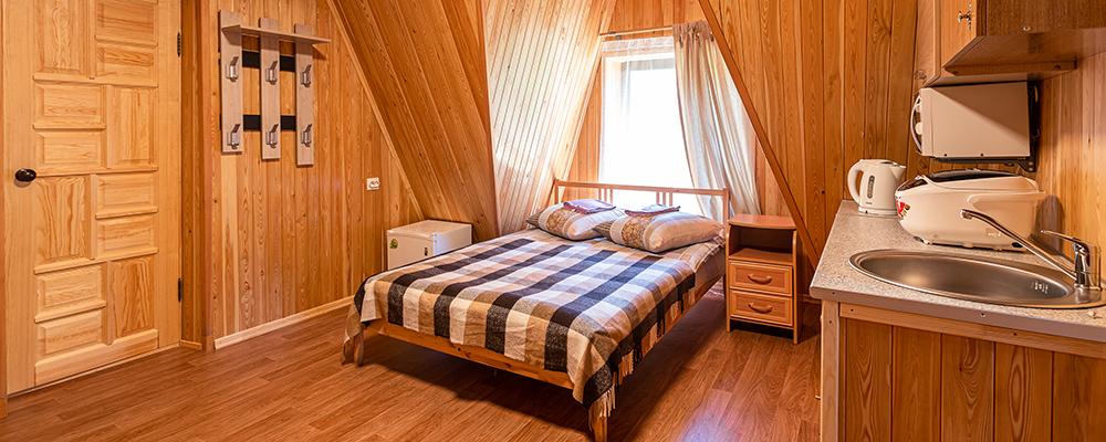 Если Вы хотите снять домик на Алтае и при этом по-максимуму сэкономить на комфорте, но больше посвятить себя горам, солнцу, замечательным видам, то — это вариант для Вас. Вы будете надежно защищены от сырости, дождя и ветра. У Вас хватит места, чтобы разместить вещи. Вы сможете всегда подзарядить телефон или ноутбук. Это уже гораздо комфортнее палатки! В домике: 2 односпальные кровати или 1 двуспальная кровать, обеденный столик. Удобства: туалет, душ, умывальники, — на территории базы.
