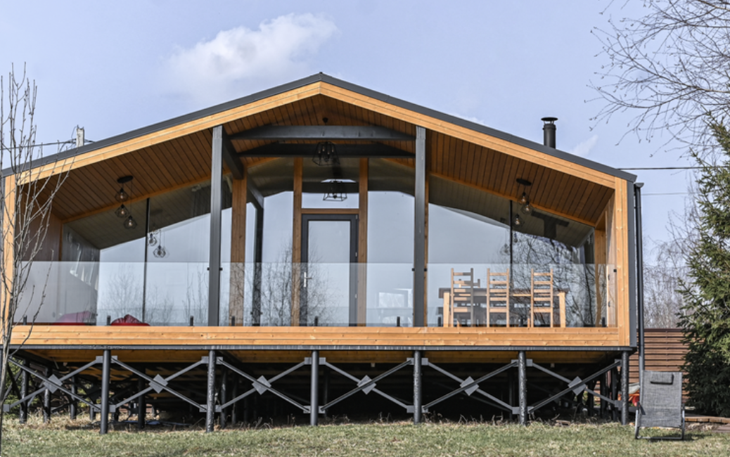 Баня с панорамными окнами и дровяной печью