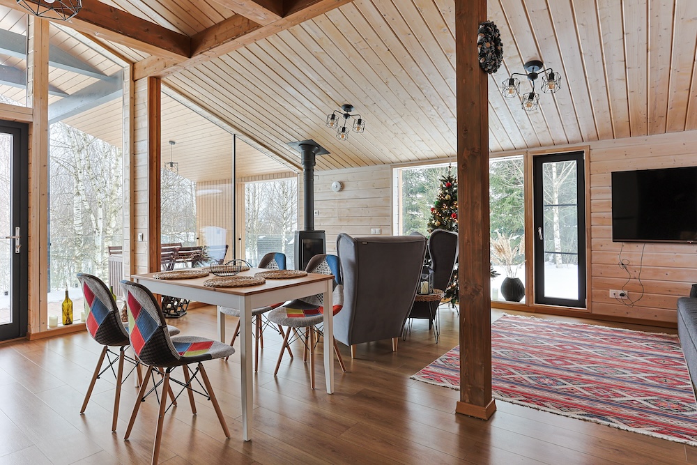 Гостиная с дизайнерским диваном, панорамным вид на лес