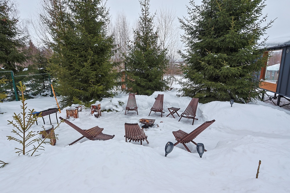 На участках расположены панорамные бани с дровяными печами и костровища с мангалами.