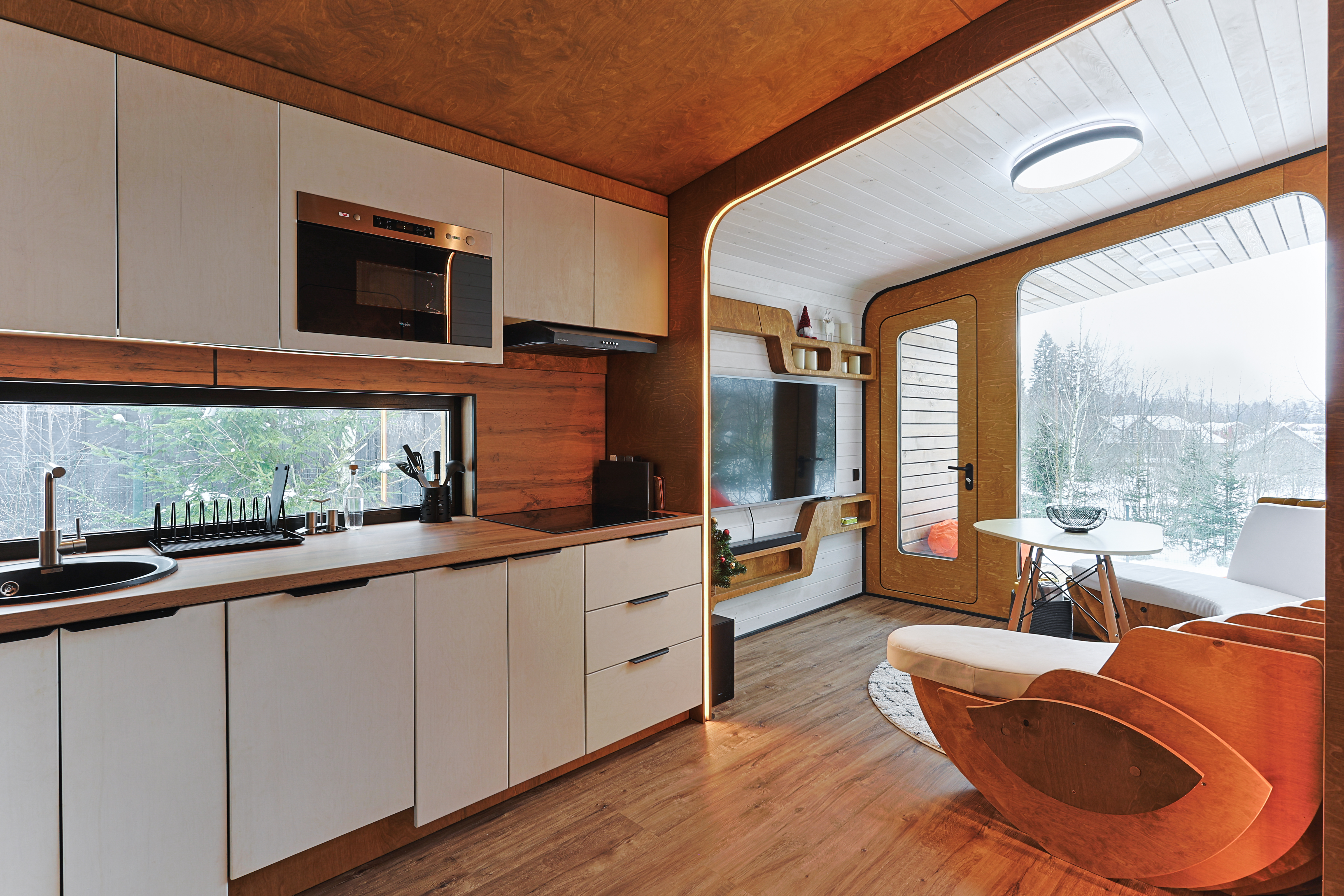 Дома оснащены современной мебелью. В гостинных комнатах установлены камины, телевизоры. Кухни оборудованы индукционными плитами, духовыми шкафами, посудомоечными машинами, холодильниками, кофемашинами и чайниками.