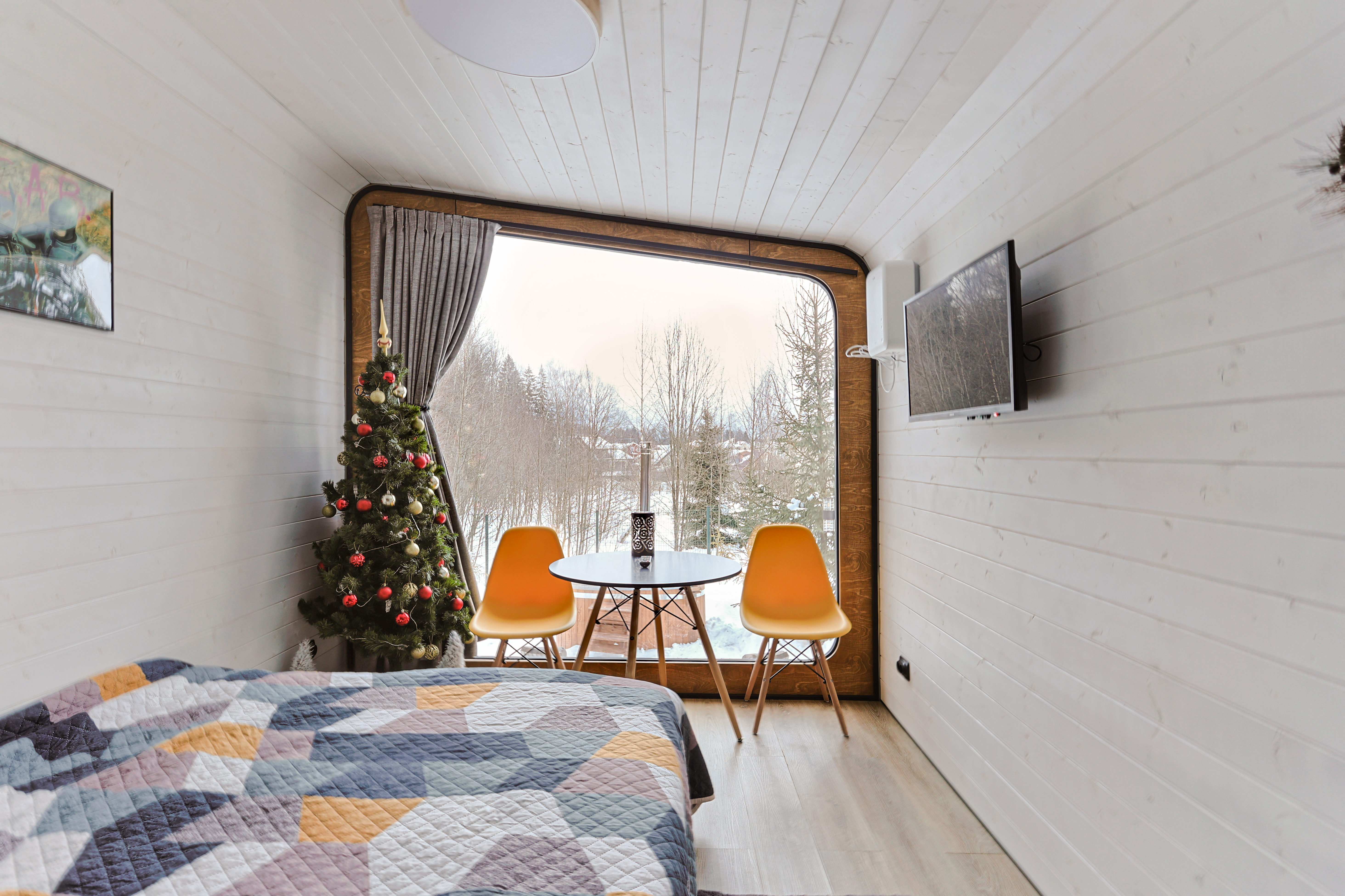 панорамное окно в спальне с видом на лес