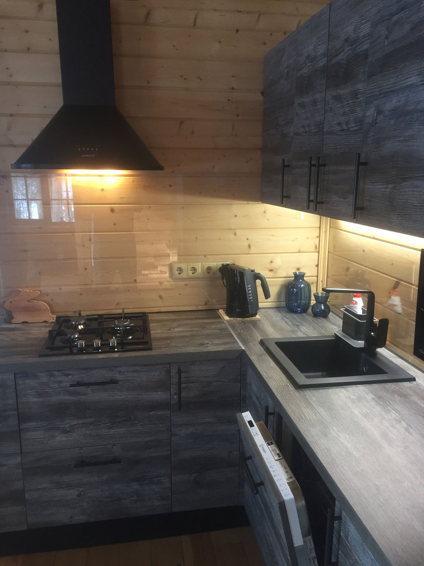 • на первом этаже коттеджа расположилась превосходная панорамная кухня-гостиная с камином и террасой, душ-туалет и гардеробная;