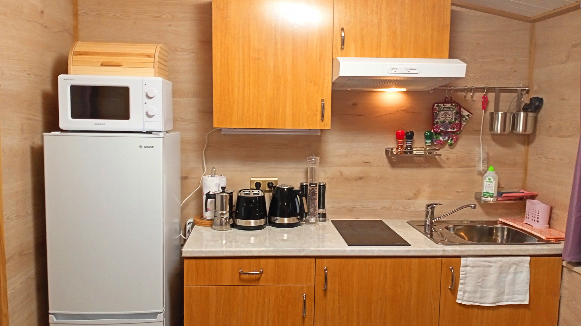 - Зона кухни оборудована холодильником, микроволновой печью, электроплитой, чайником, тостером и полным набором посуды для готовки и сервировки стола.