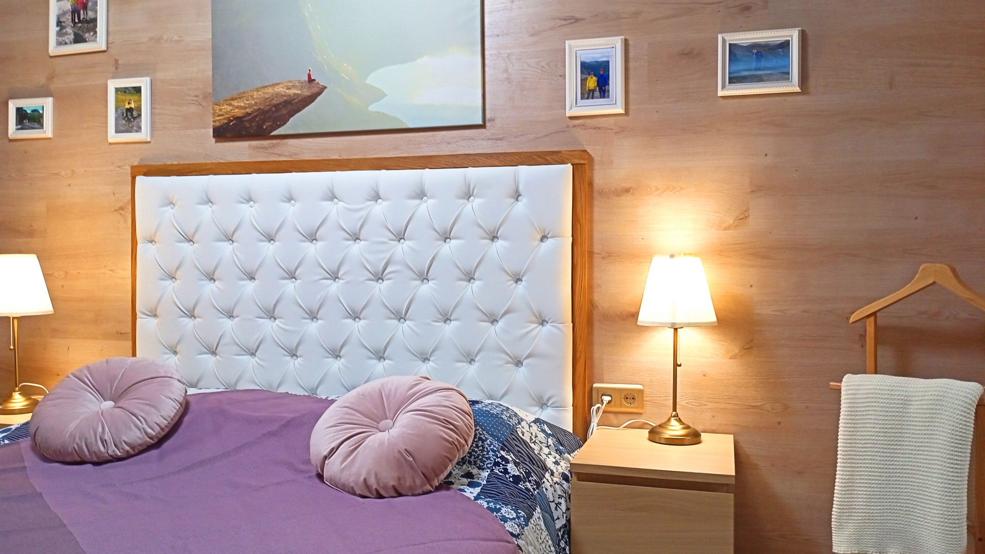 - Спальня с двуспальной дубовой кроватью с подсветкой, большим ЖК-телевизором;