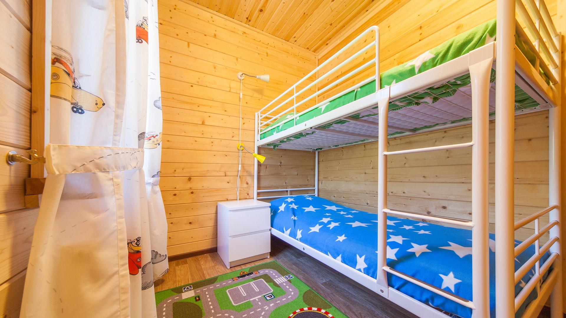 - 1 спальня с двухъярусной кроватью, прикроватной тумбой, комодом. Спальня оформлена в стиле детской.