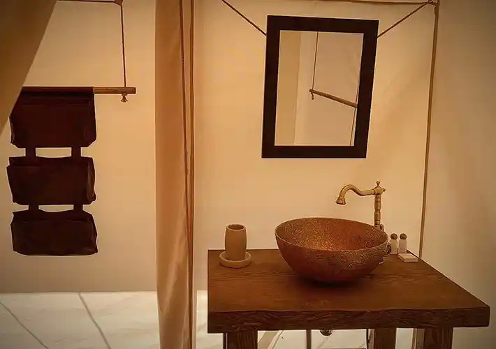 В глэмпингах мы предоставляем по вашему запросу принадлежности для душа, зубную щетку и пасту.