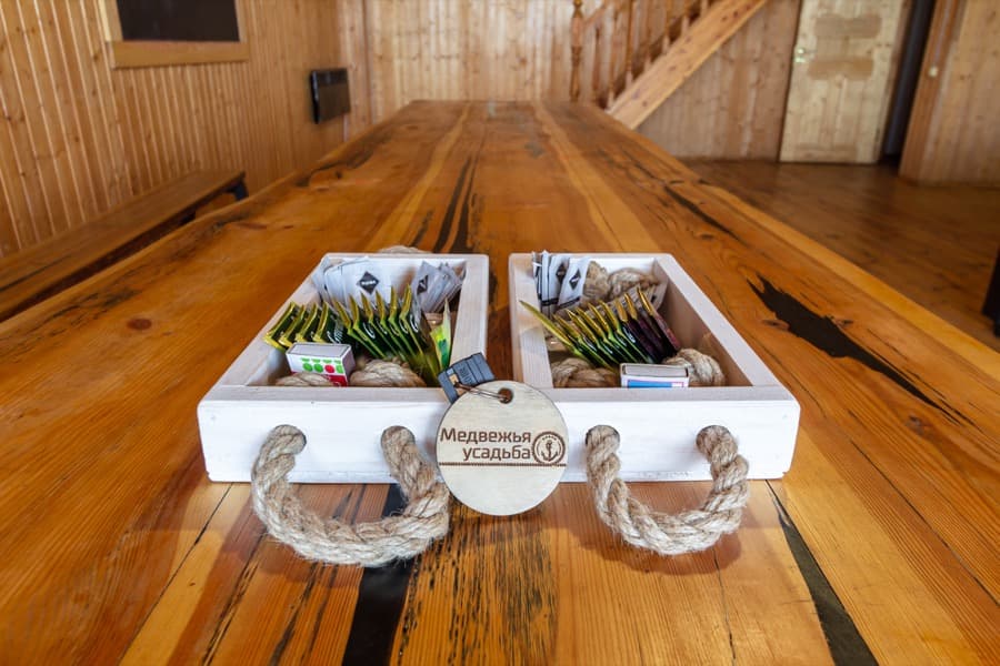 В домике небольшая кухня, посуда на шесть персон, электрический чайник, микроволновка, холодильник, музыкальный центр и ЖК телевизор со спутниковым ТВ. Т.к. мы боремся за чистоту озера, в коттедже установлен современный биотуалет.