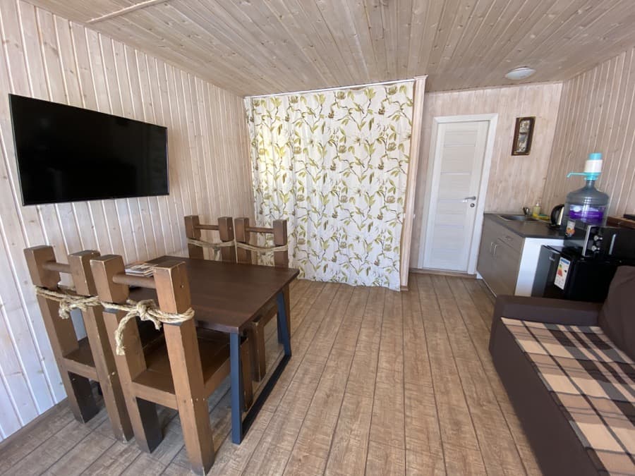 В коттедже имеется: мини-кухня, чайник, микроволновка, холодильник, посуда и приборы для четверых, цифровое и смарт ТВ, интернет (Wi-Fi).
