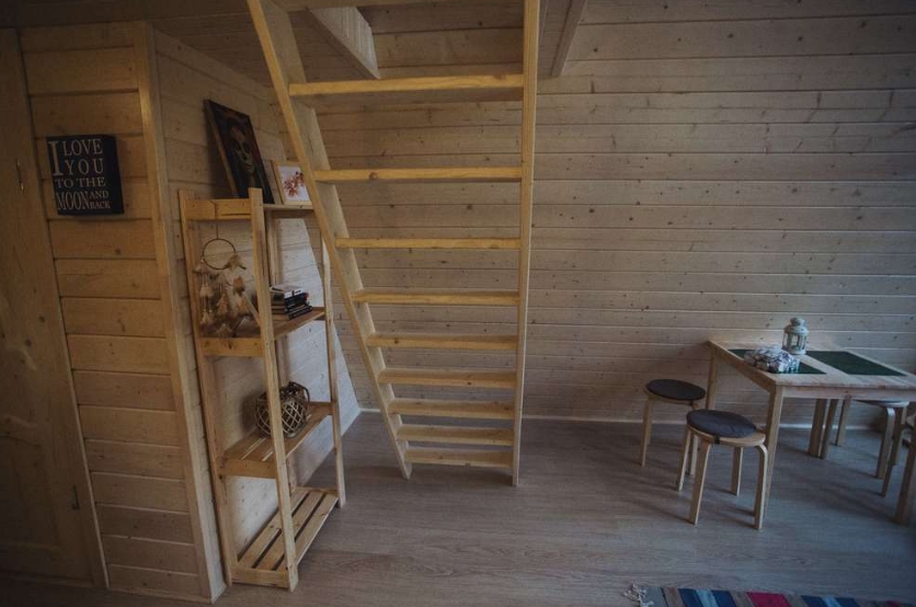 Двуспальная кровать на втором этаже, внизу — двуспальный диван и оборудованная кухня, туалет и душ.