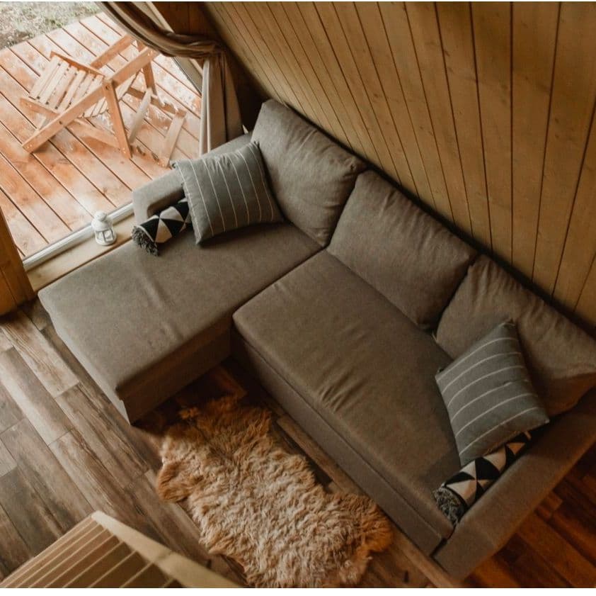 Имеет два двухспальных места - кровать на втором этаже и раскладной диван на первом этаже.