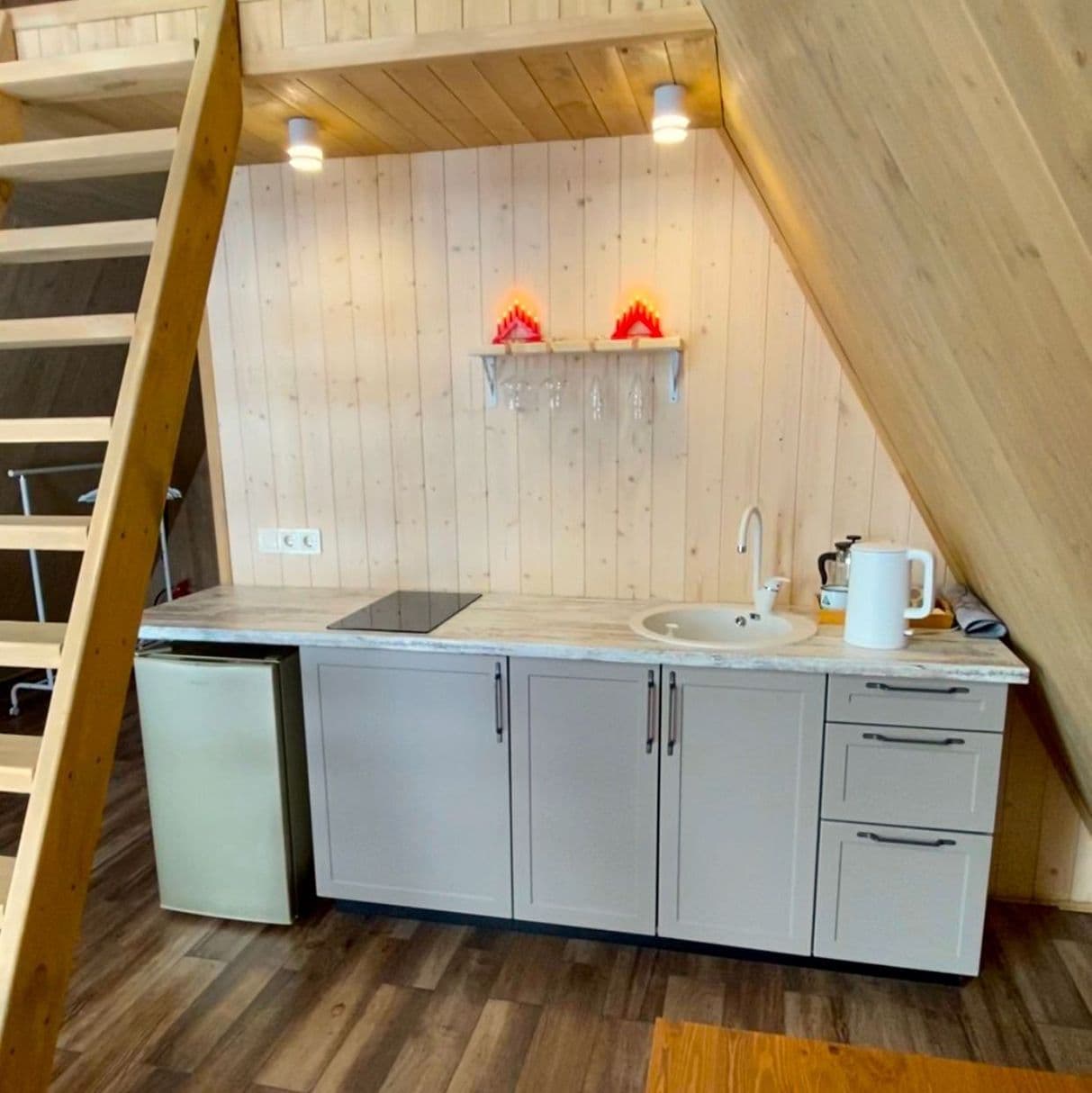 - В домике полностью оборудована кухня, у каждого домика индивидуальная мангальная зона.