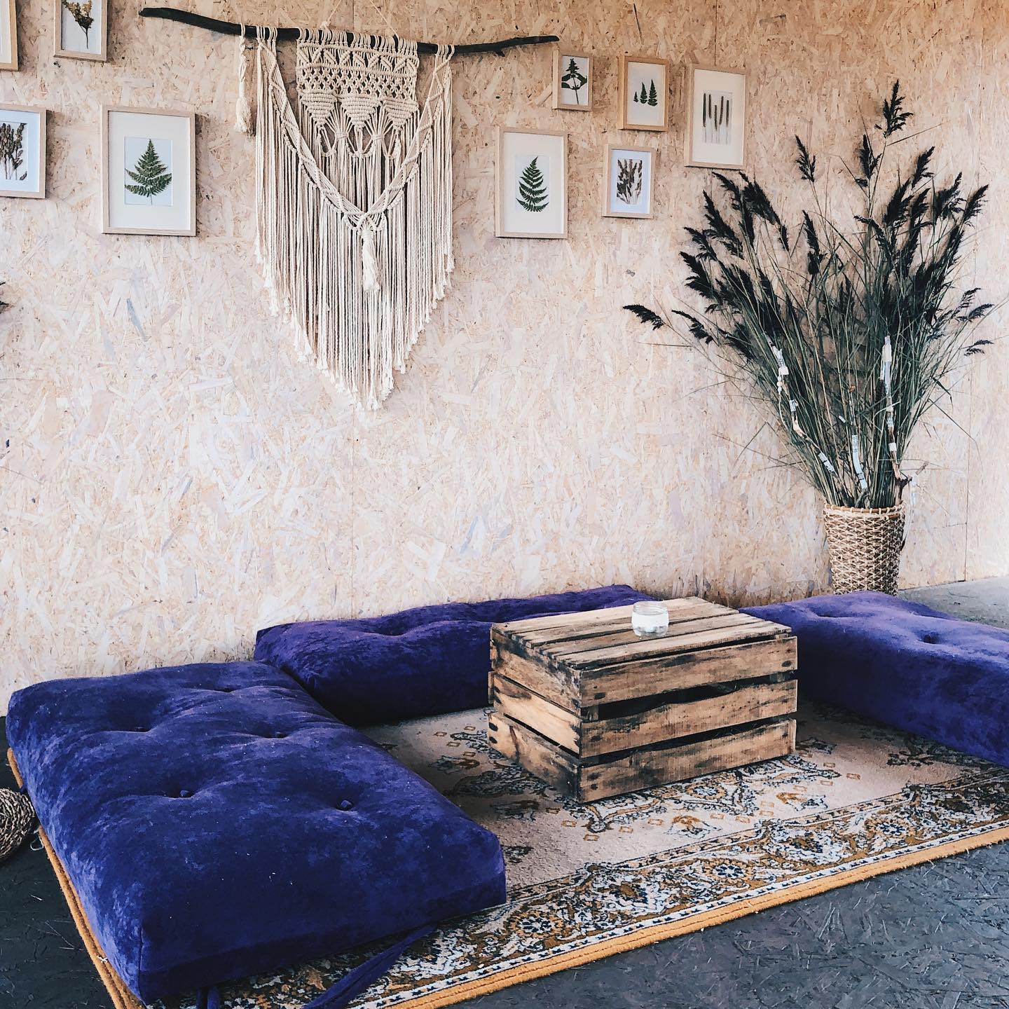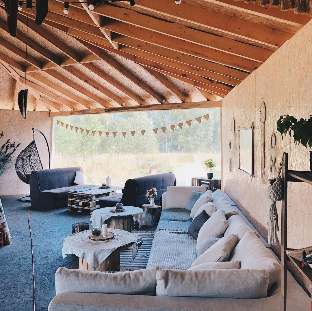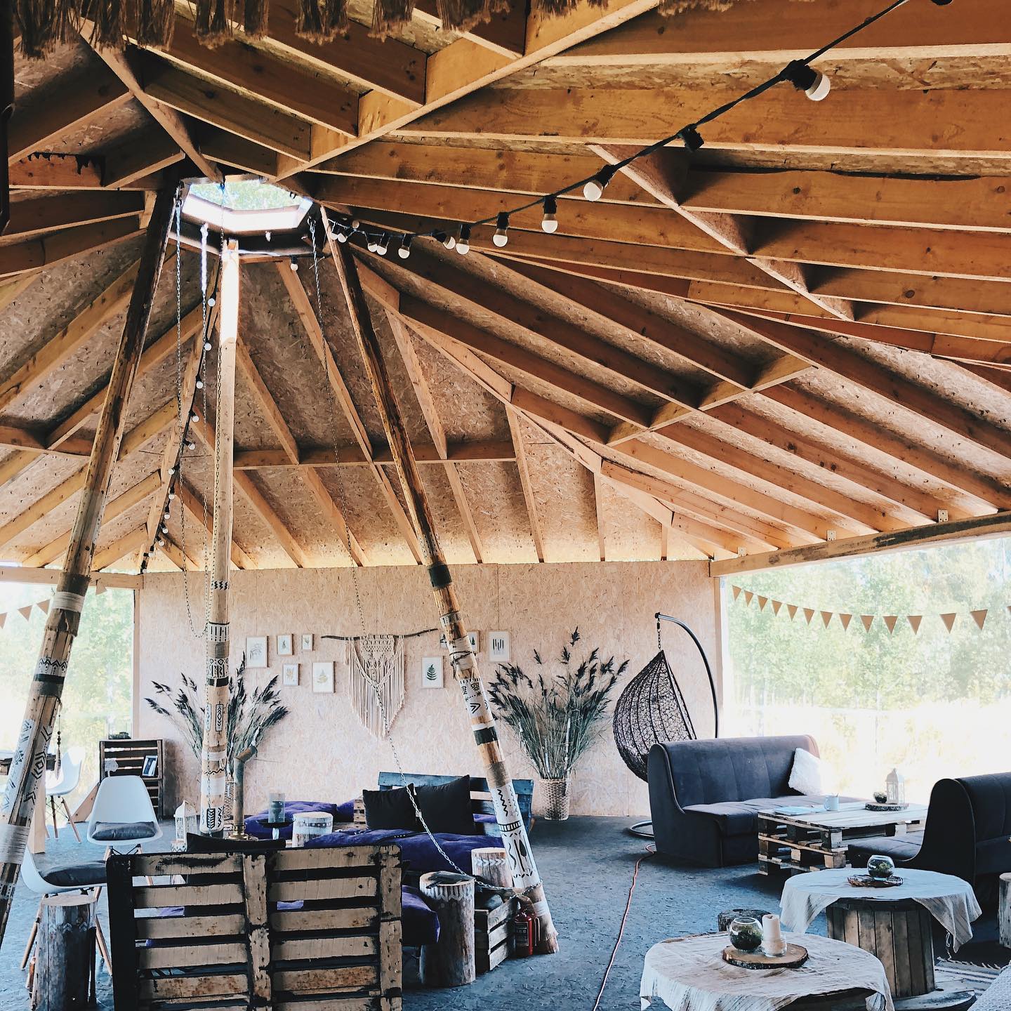 — lounge-зона: пространство представляет из себя огромный шатер-гостиную с очагом-костром по центру;