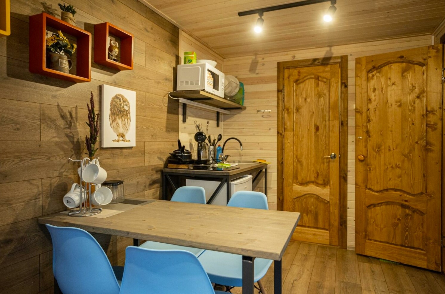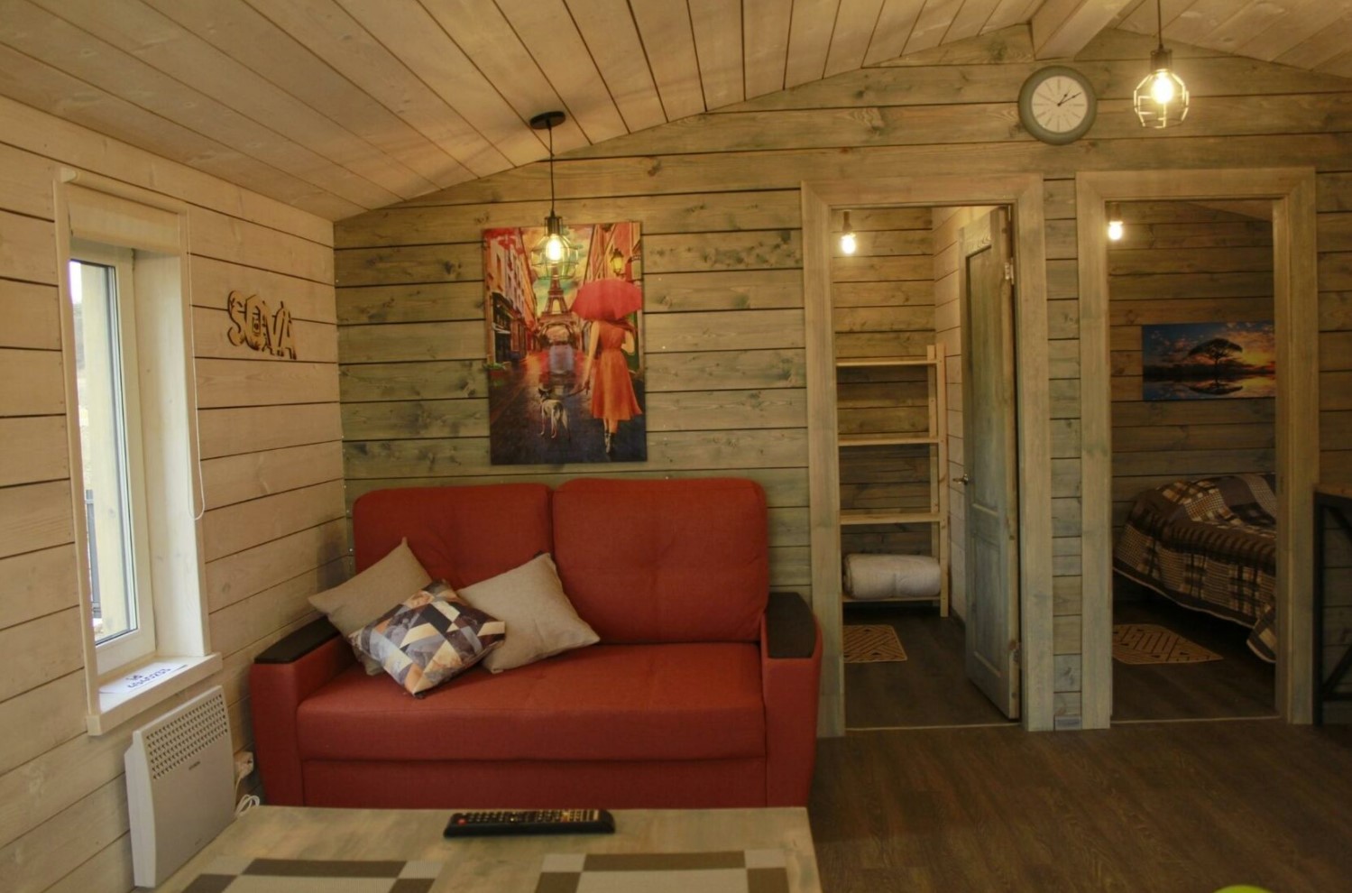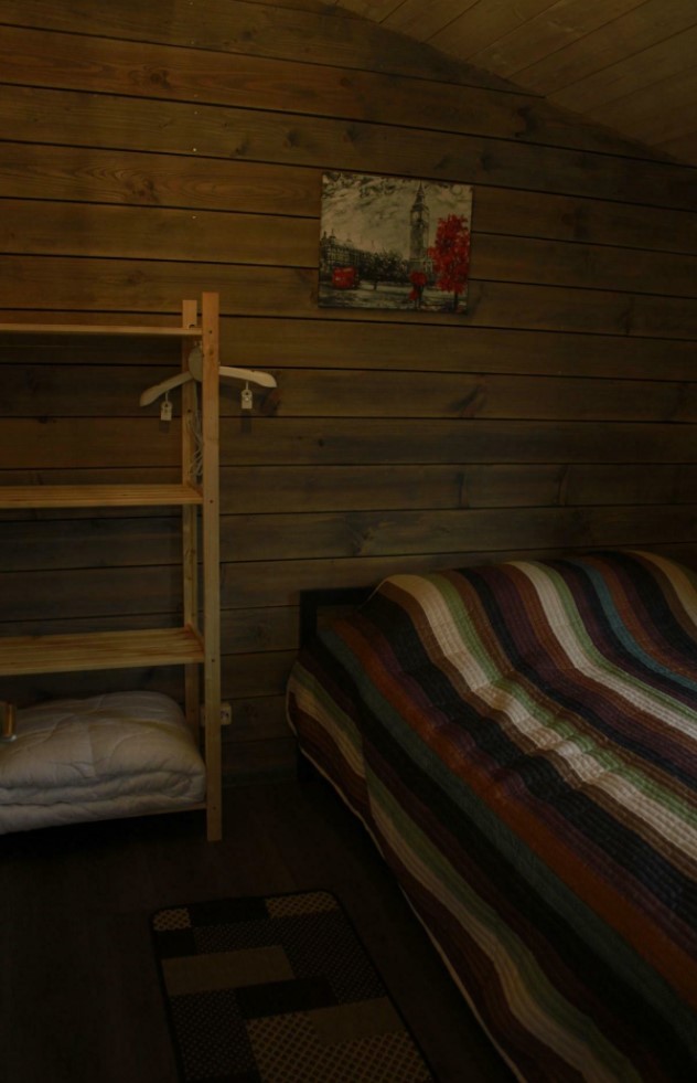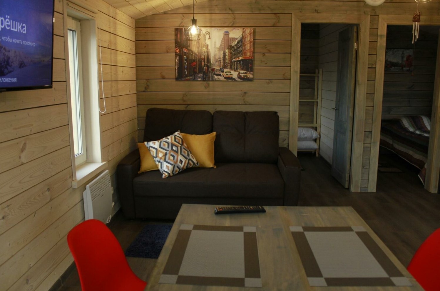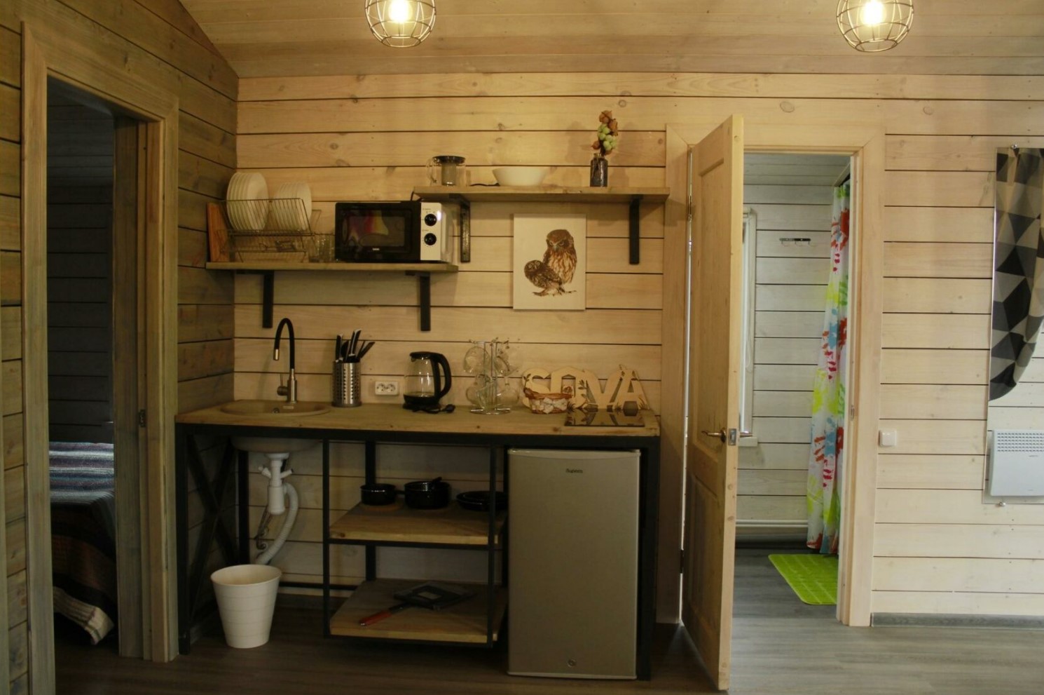 Парная на дровах, просторная гостиная с кухонной зоной. Стол, посуда, чайник, холодильник, микроволновая печь. Телевизор, Wi-Fi, диван, отопление. Санузел, душ.