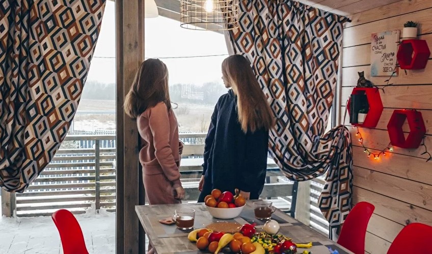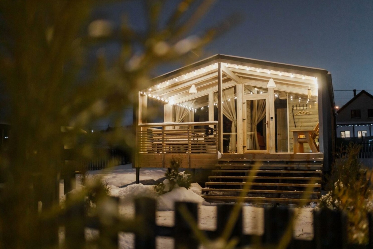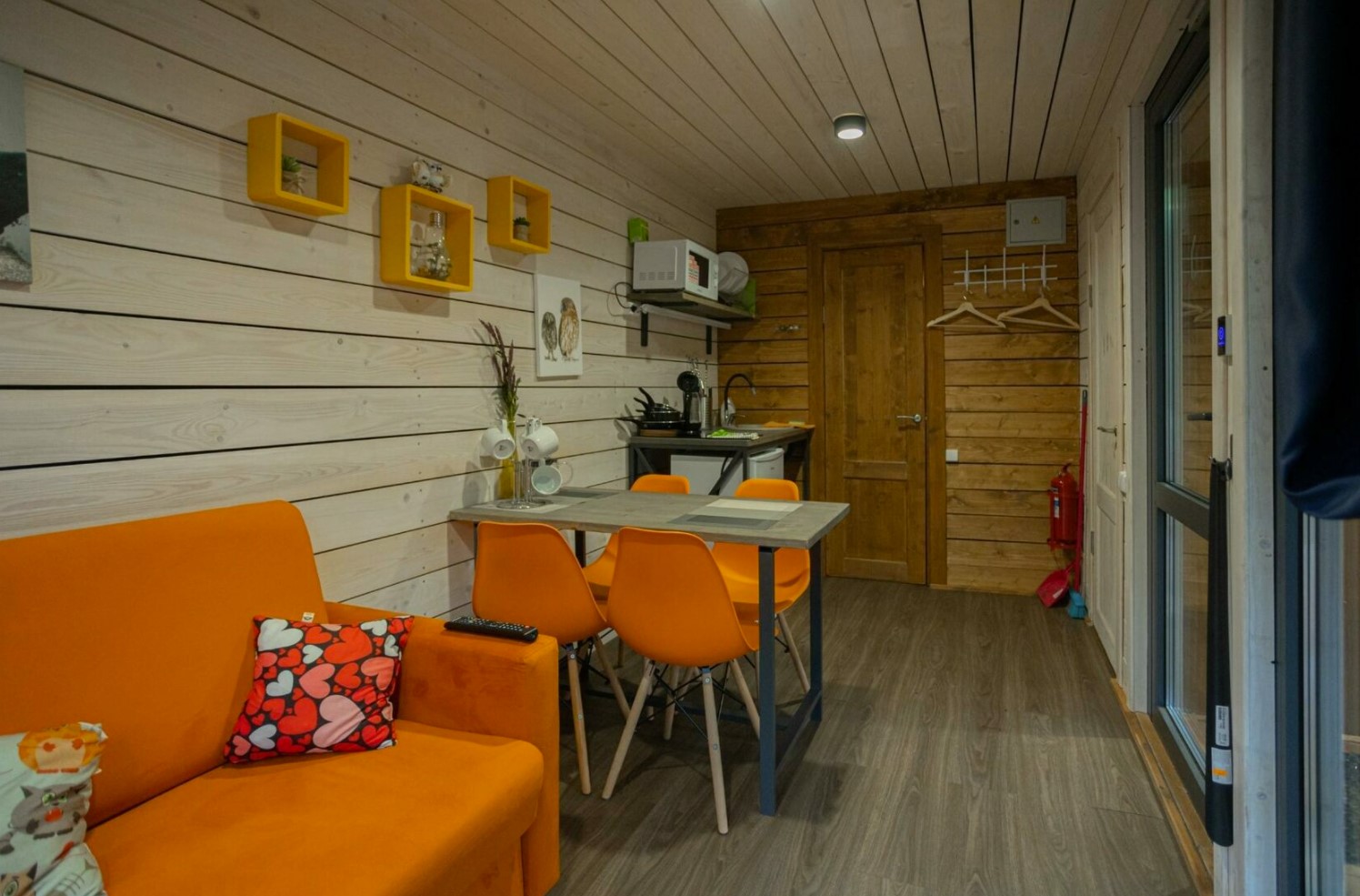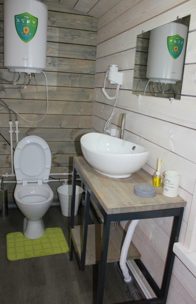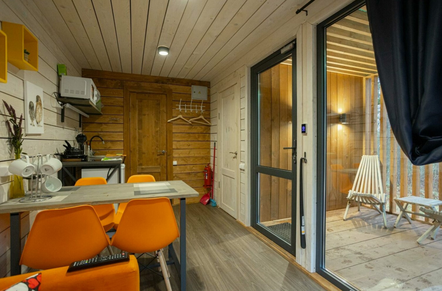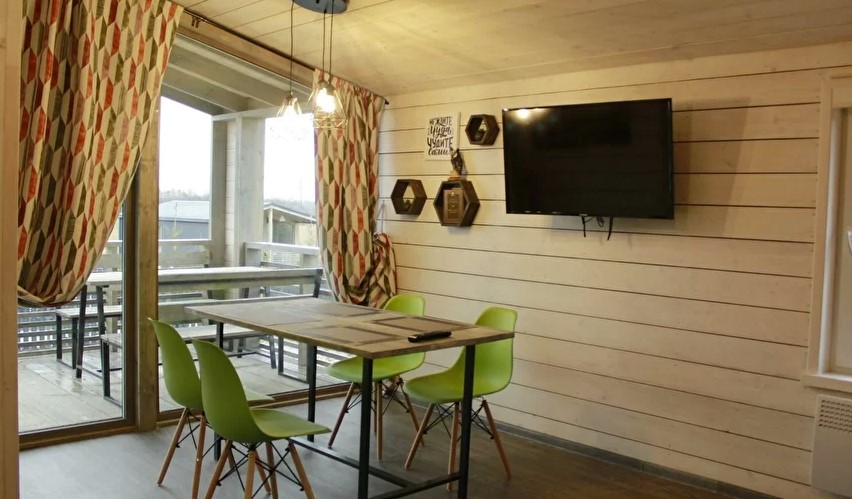 Парная на дровах, просторная гостиная с кухонной зоной. Стол, посуда, чайник, холодильник, микроволновая печь. Телевизор, Wi-Fi, диван, отопление. Санузел, душ.