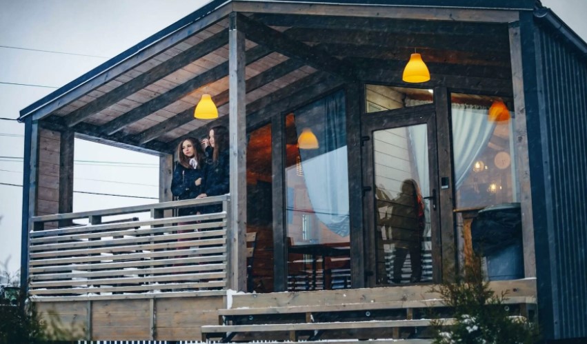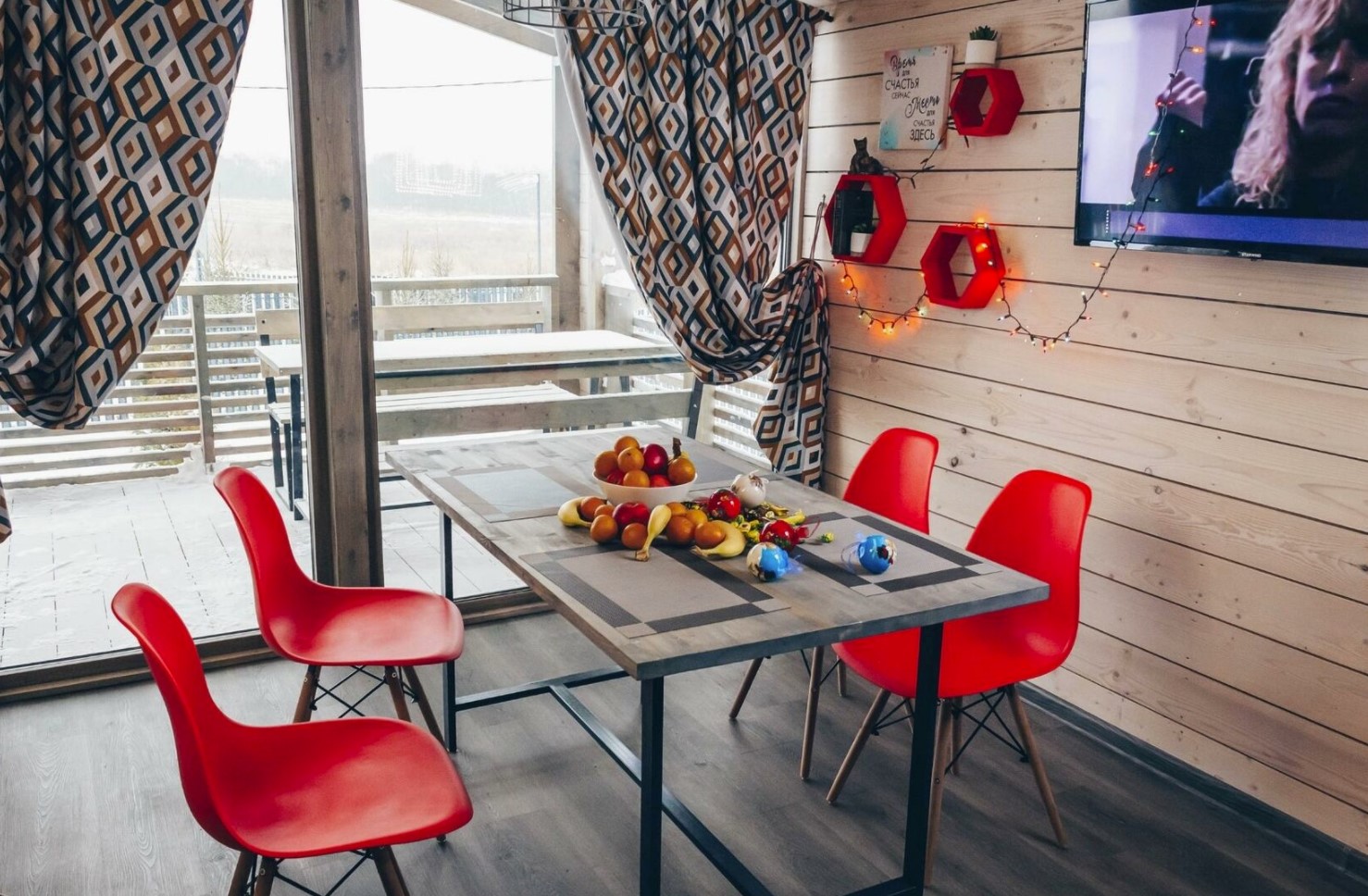 Камин, панорамные окна, терраса с гамаком и столом для застолий на свежем воздухе.
