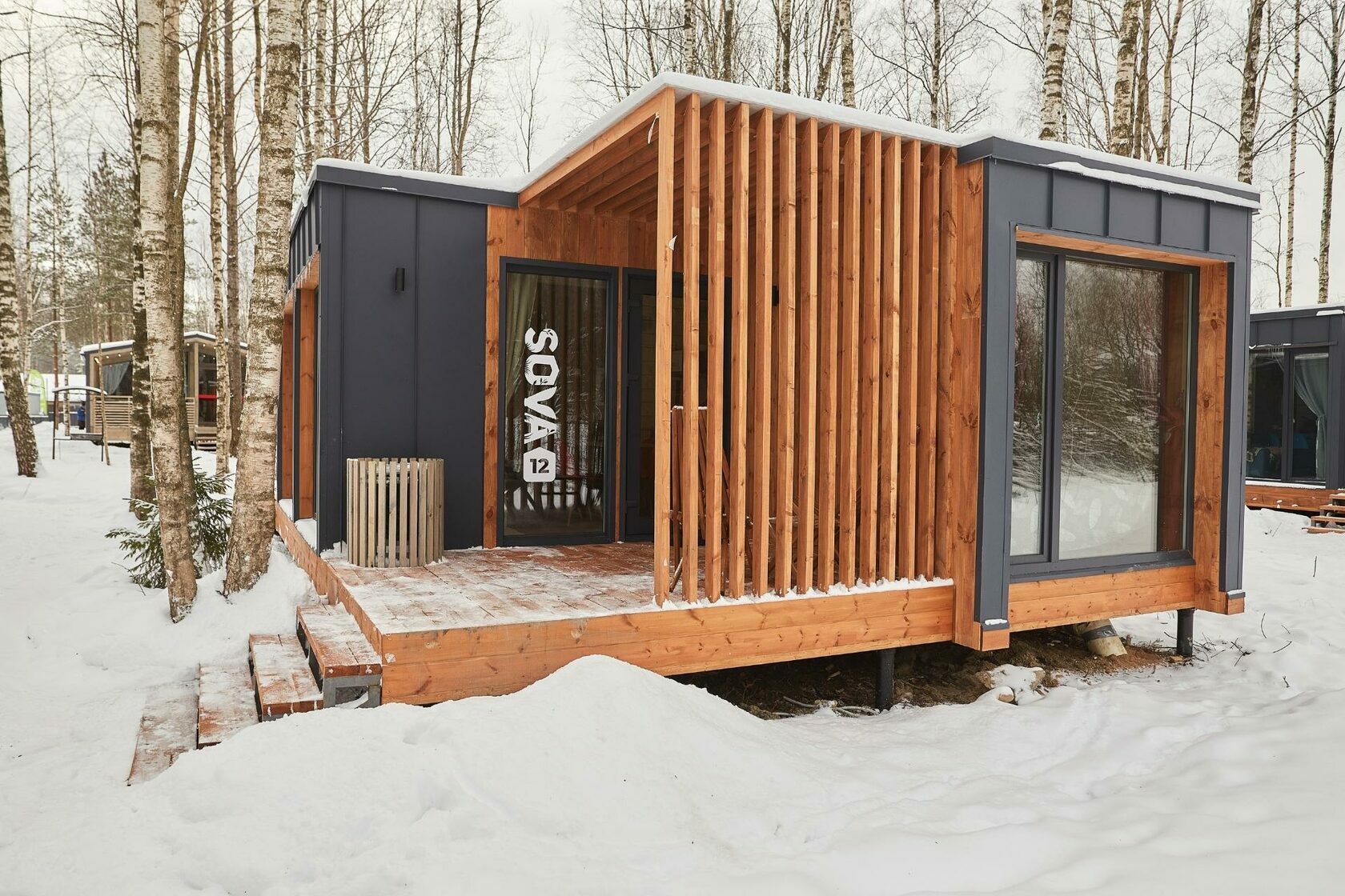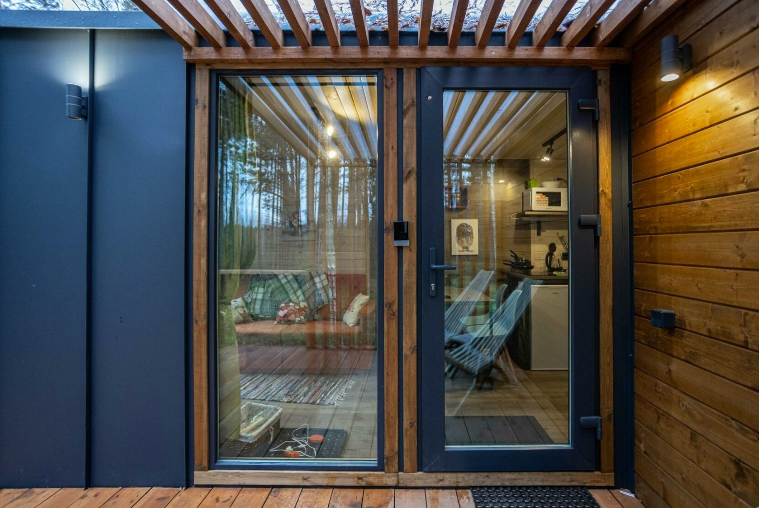 Панорамные окна в спальне и гостиной, крытая терраса, выходящая в лес