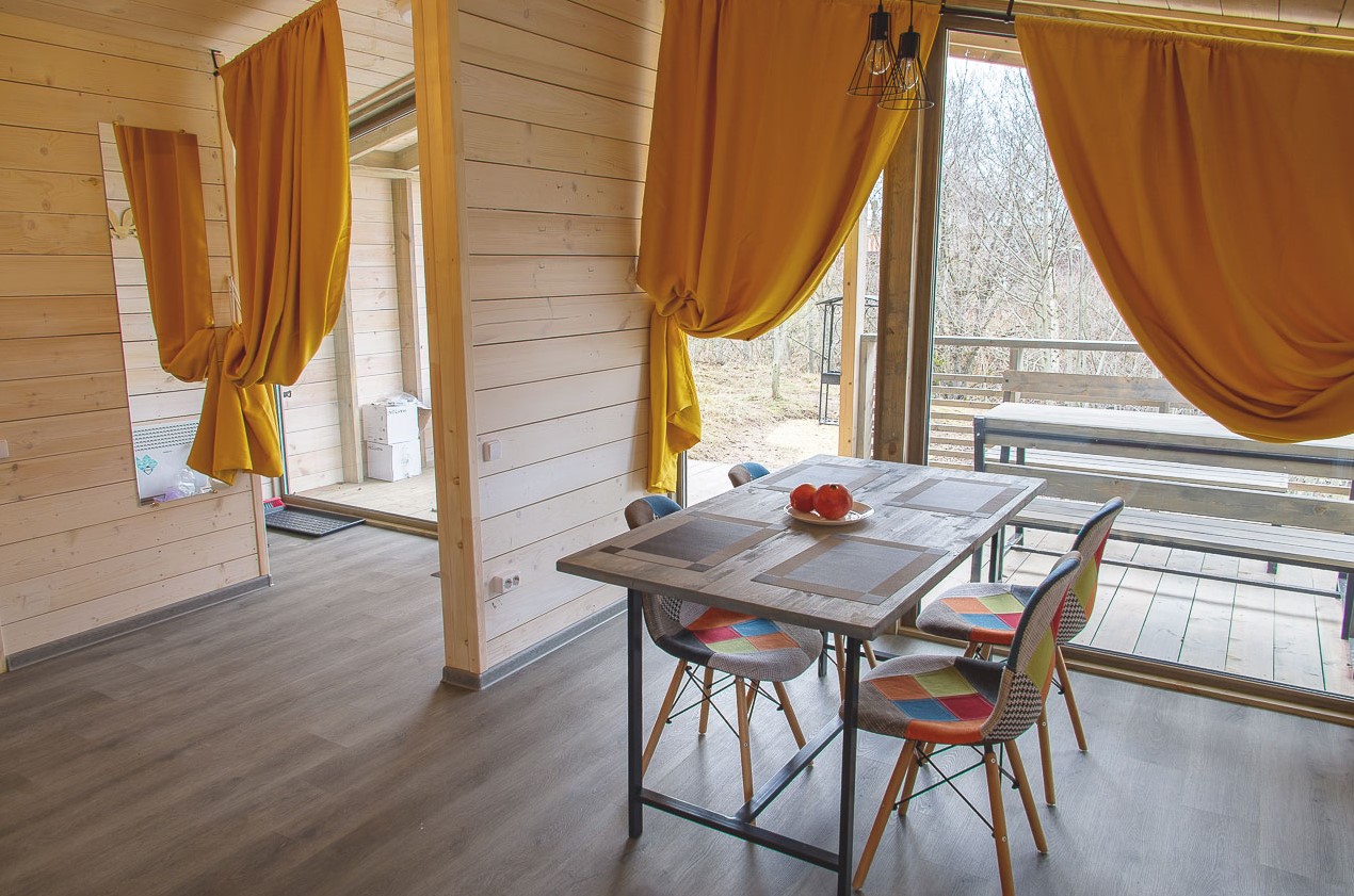 Панорамные окна, терраса с гамаком и столом для застолий на свежем воздухе.