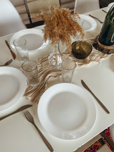 СЕРВИРОВКА СТОЛА: элементы декора, свечи, ваза, санитайзер. Тарелки плоские, столовые приборы, стаканы для холодных напитков, чашки для чая, винные бокалы, рюмки ВСЕ ПОД КАЖДОГО ГОСТЯ; салатница, пиалы, тарелка для закусок, графины на соответствующее количество человек, нож, штопор, разделочная доска, пепельница, кухонные салфетки. Сахар, соль, чай. (посуда моется в посудомоечных машинах)
