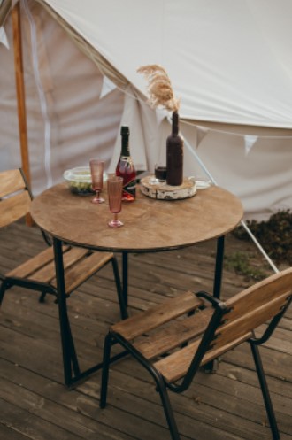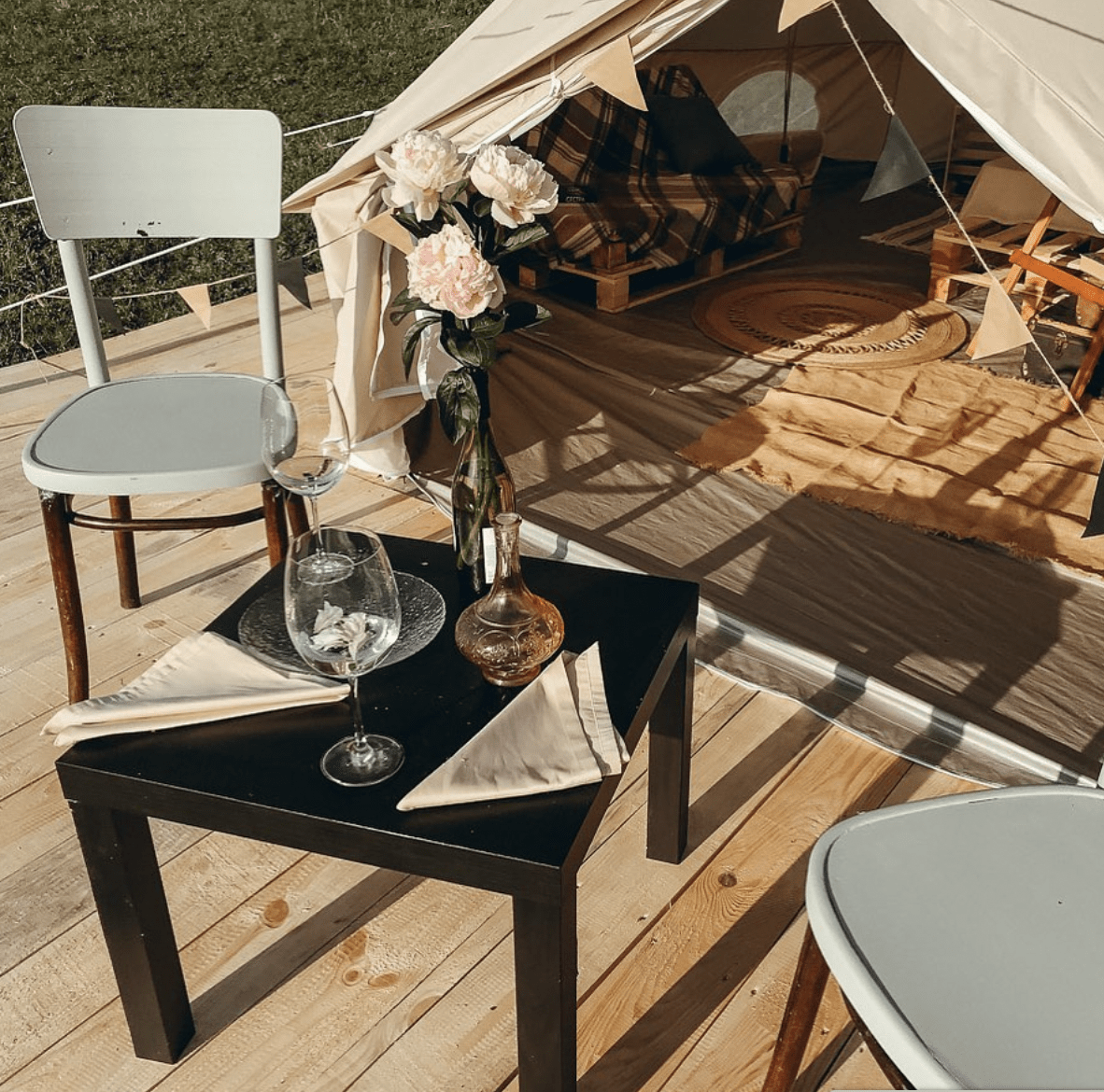 Шатер (20 кв м) на деревянном настиле (6*8м) веранда перед шатром со столиком и стульями .