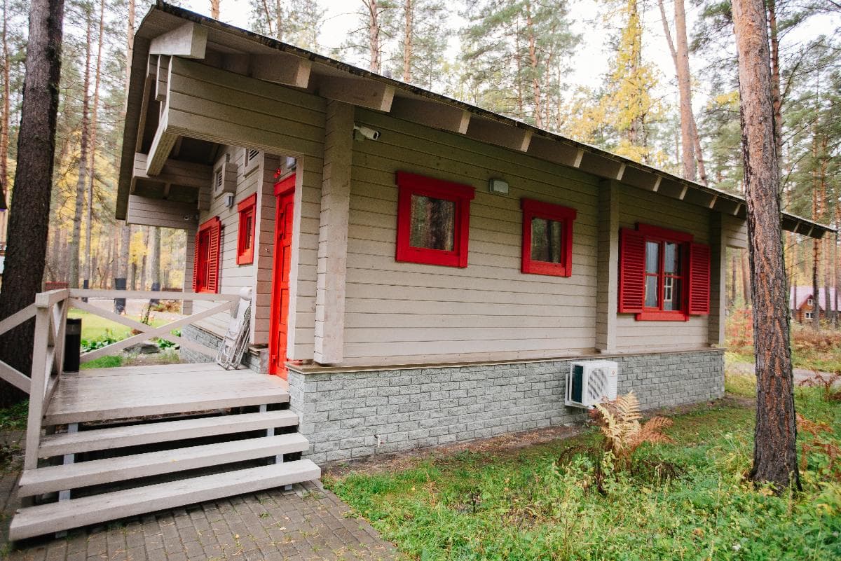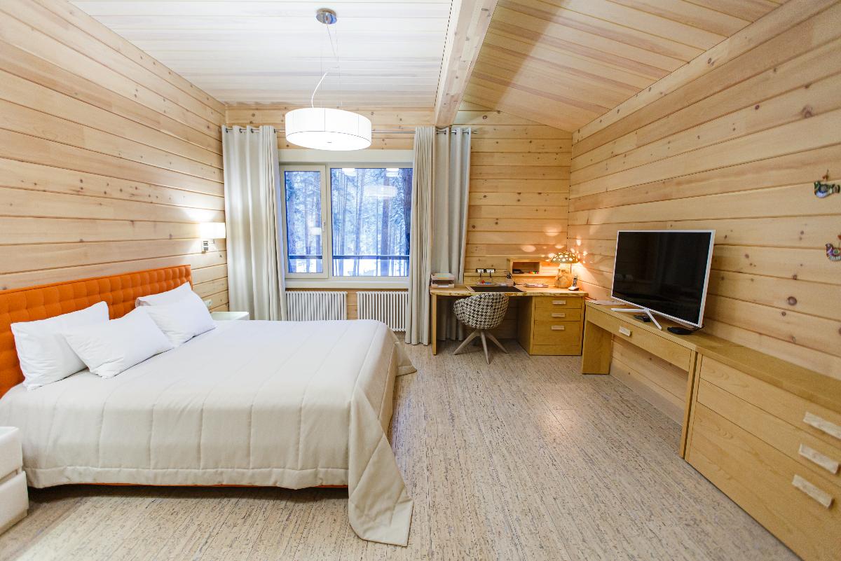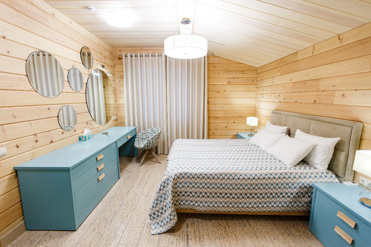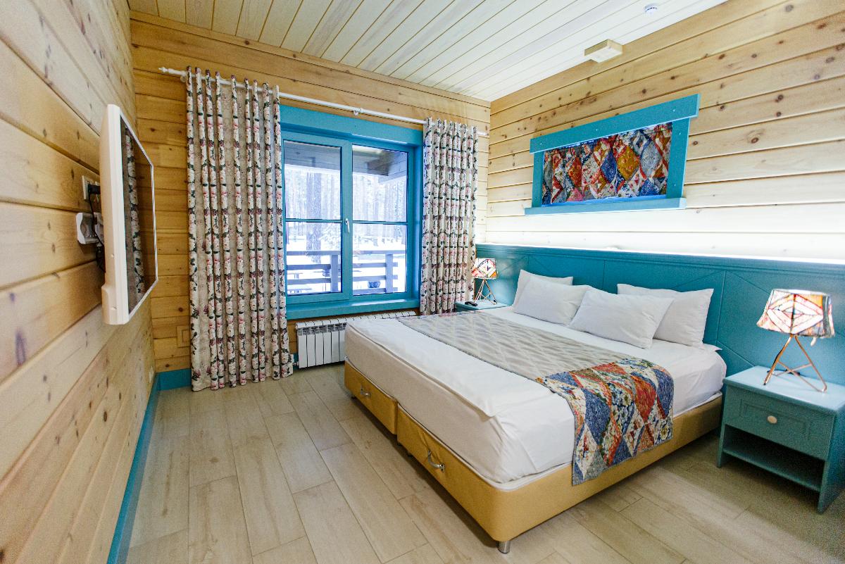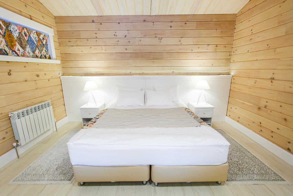 Просторный Коттедж класса" Де Люкс", с интересным архитектурным решением. Уникальное место для отдыха вашей семьи и компании. Две просторные спальни, с двуспальными кроватями позаботятся о вашем сне. В каждой из спален находится индивидуальная ванная комната. Расположен в лесной части отеля. Тёплые полы, мягкие халаты, декор выполненный в стиле Hand Made создают уникальную атмосферу уюта и комфорта для вашего отдыха. В стоимость проживания входит: мангальная зона, костровая беседка, детская комната, детская игровая площадка, уличный тренажёрный комплекс. Проживание с домашними животными - запрещено.