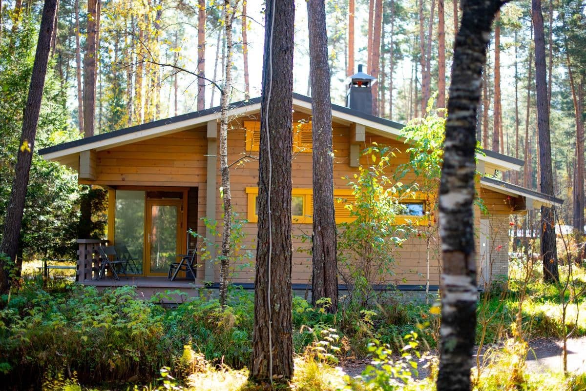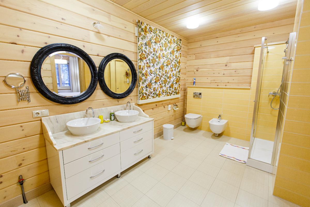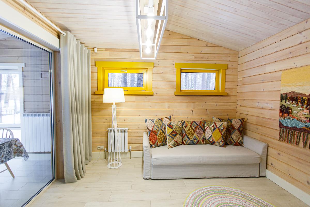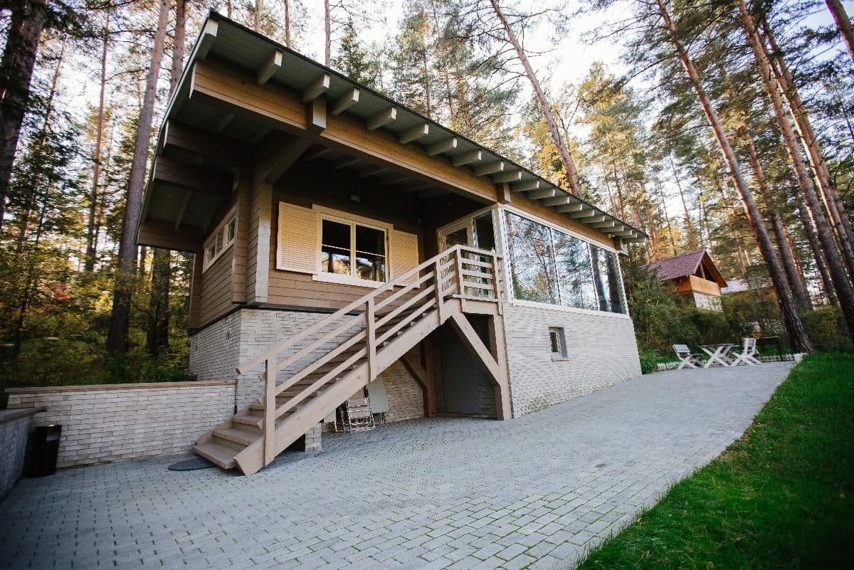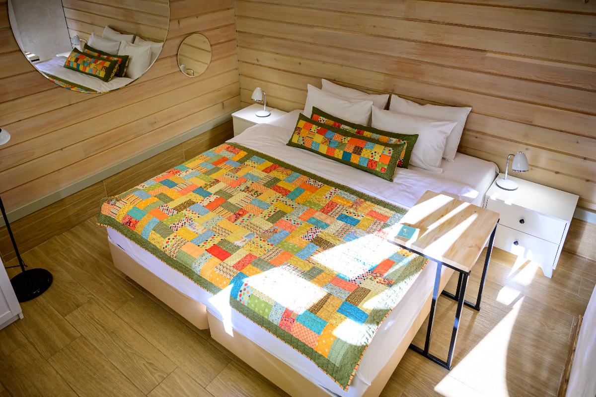 Просторный Коттедж класса" Де Люкс", с интересным архитектурным решением. Уникальное место для отдыха вашей семьи и компании. Две просторные спальни, с двуспальными кроватями позаботятся о вашем сне. В каждой из спален находится индивидуальная ванная комната. Расположен в лесной части отеля. Тёплые полы, мягкие халаты, декор выполненный в стиле Hand Made создают уникальную атмосферу уюта и комфорта для вашего отдыха. В стоимость проживания входит: мангальная зона, костровая беседка, детская комната, детская игровая площадка, уличный тренажёрный комплекс. Проживание с домашними животными - запрещено.