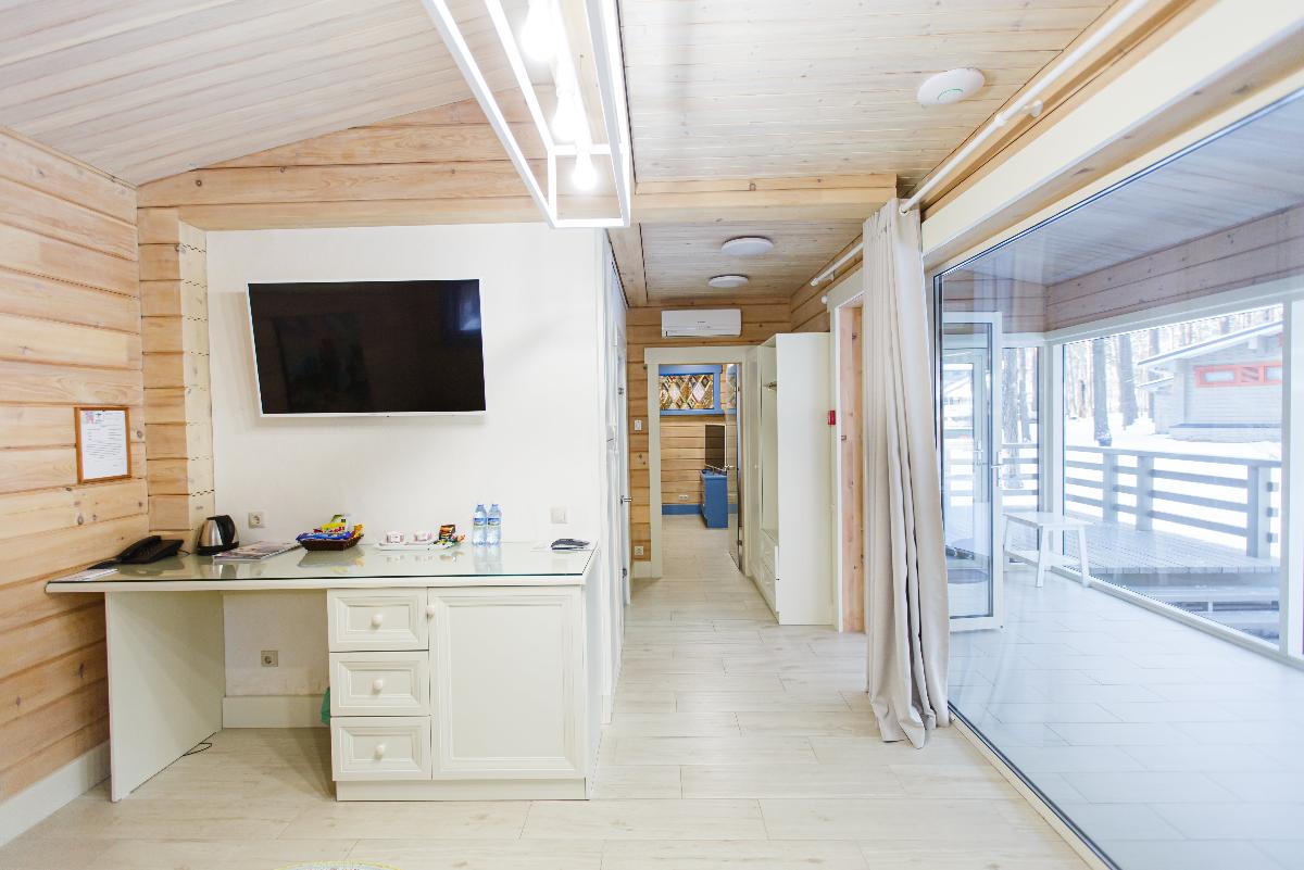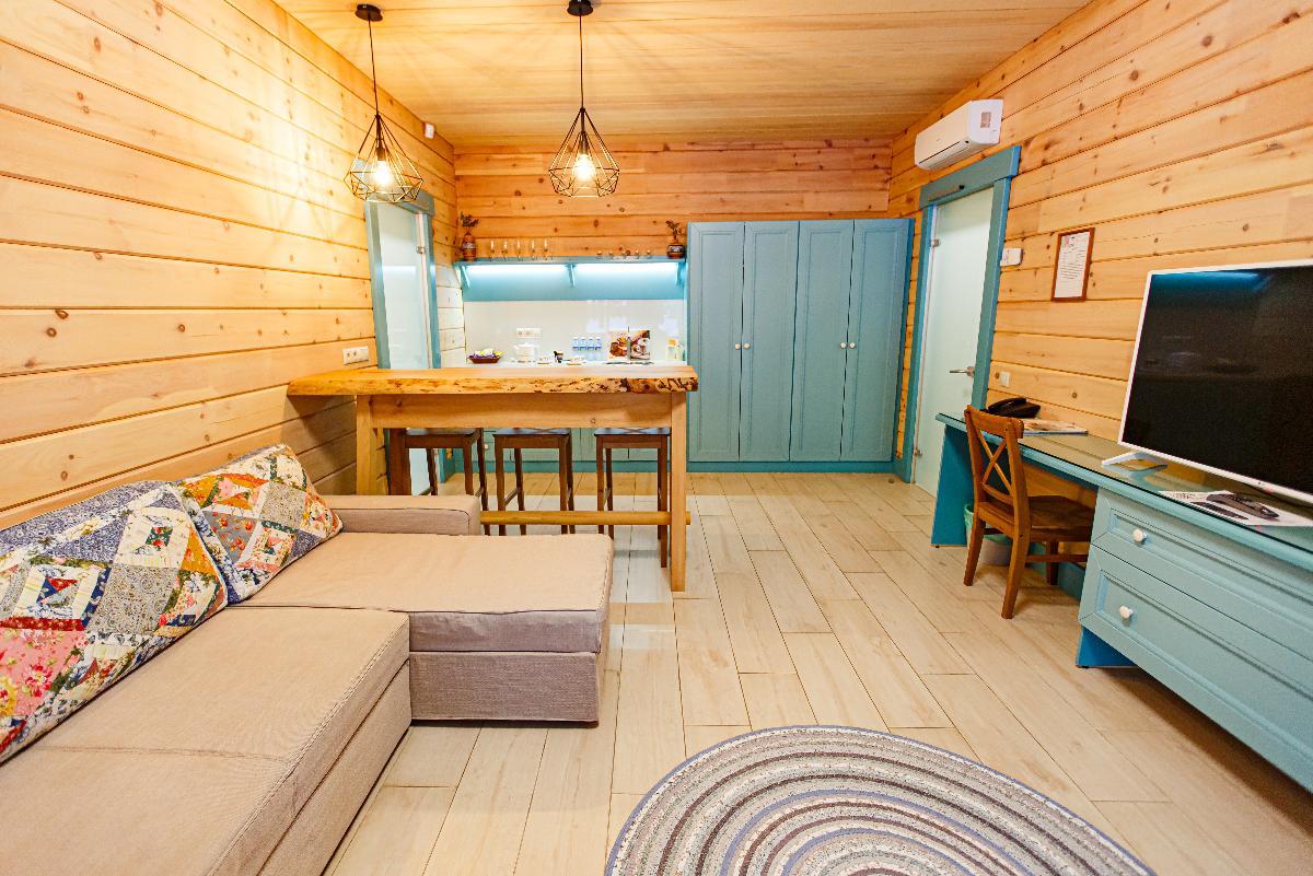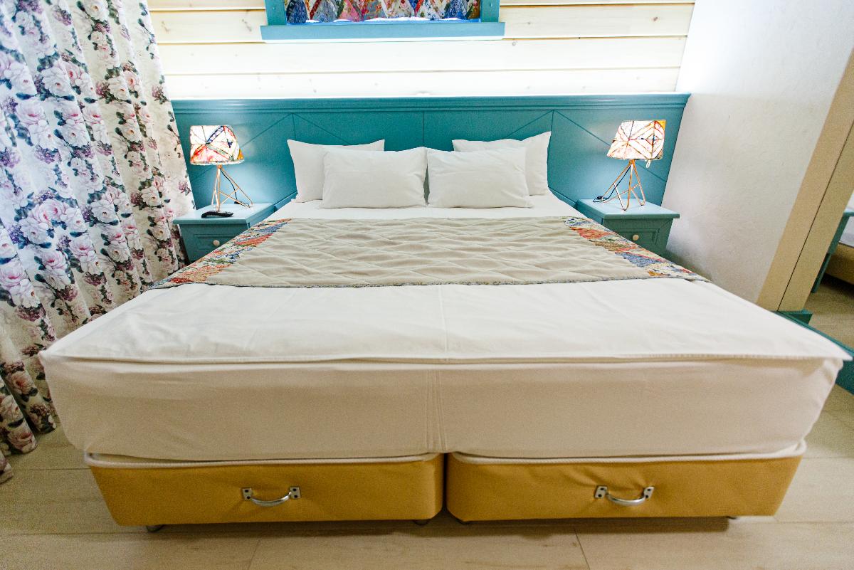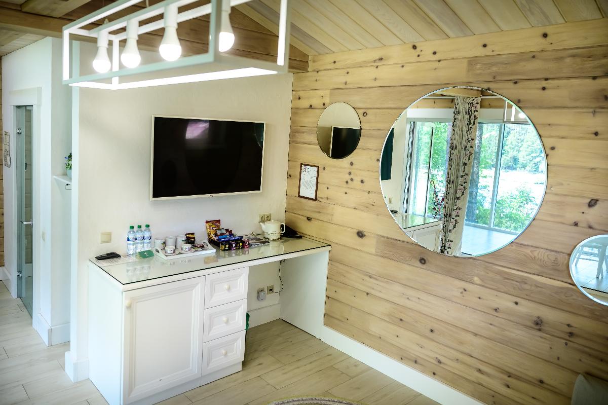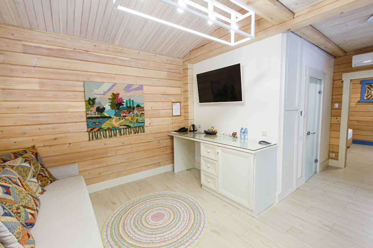 Номер класса «Полулюкс» горного отеля «Тэнери» - расположен в отдельно стоящем комплексе из четырех номеров. «Полулюкс» отличный вариант для отдыха вдвоем, в номере две односпальные кровати, с возможностью двуспального варианта, удобная чайная зона, холодильник, гардероб и ванная комната. Тёплые полы, мягкие халаты, декор выполненный в стиле Hand Made создают уникальную атмосферу уюта и комфорта для вашего отдыха. В стоимость проживания входит: мангальная зона, костровая беседка, детская комната, детская игровая площадка, уличный тренажёрный комплекс. Проживание с домашними животными - запрещено.(Примечание к номеру Полулюкс - хорошая слышимость).