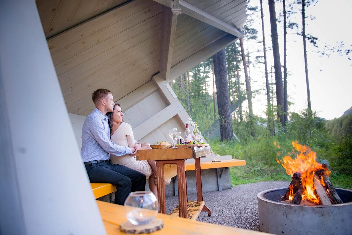 Отель предлагает комфорт и безупречный сервис в самом сердце Алтая! На берегу Катуни расположены костровые беседки с пледами, смотровые площадки, а также блюда алтайской и европейской кухни с доставкой в домики из кедрового бруса.