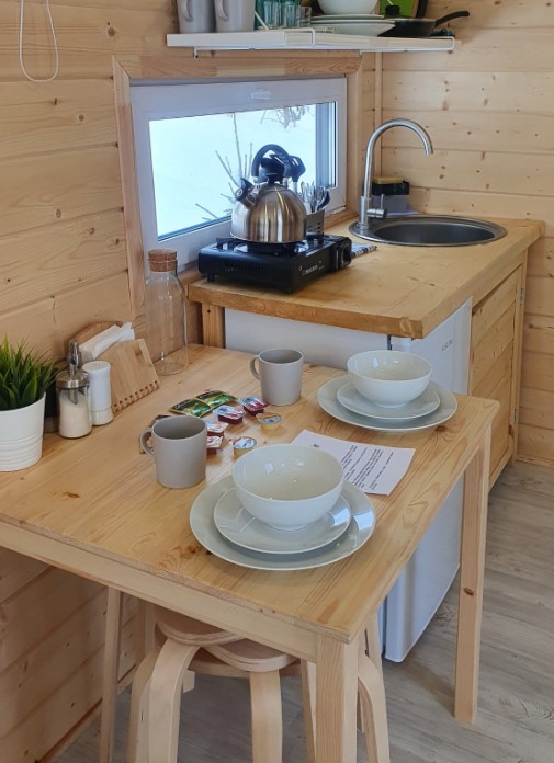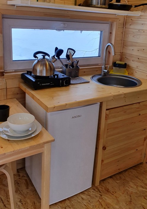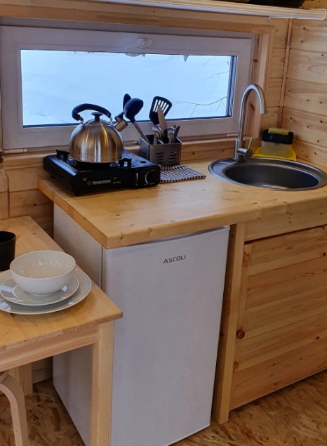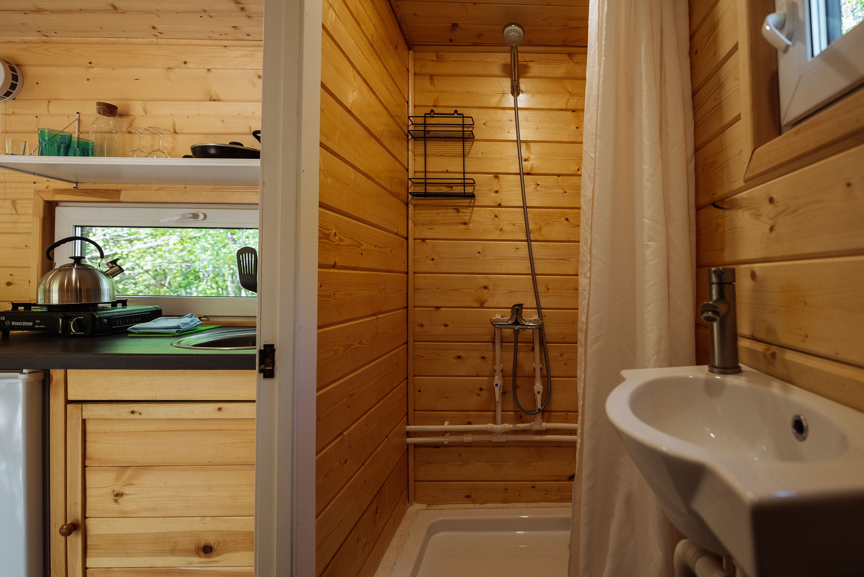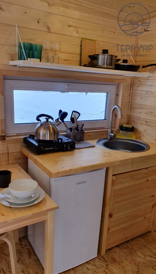 - Собственная душевая с туалетом и раковиной, расположена в каждом домике.